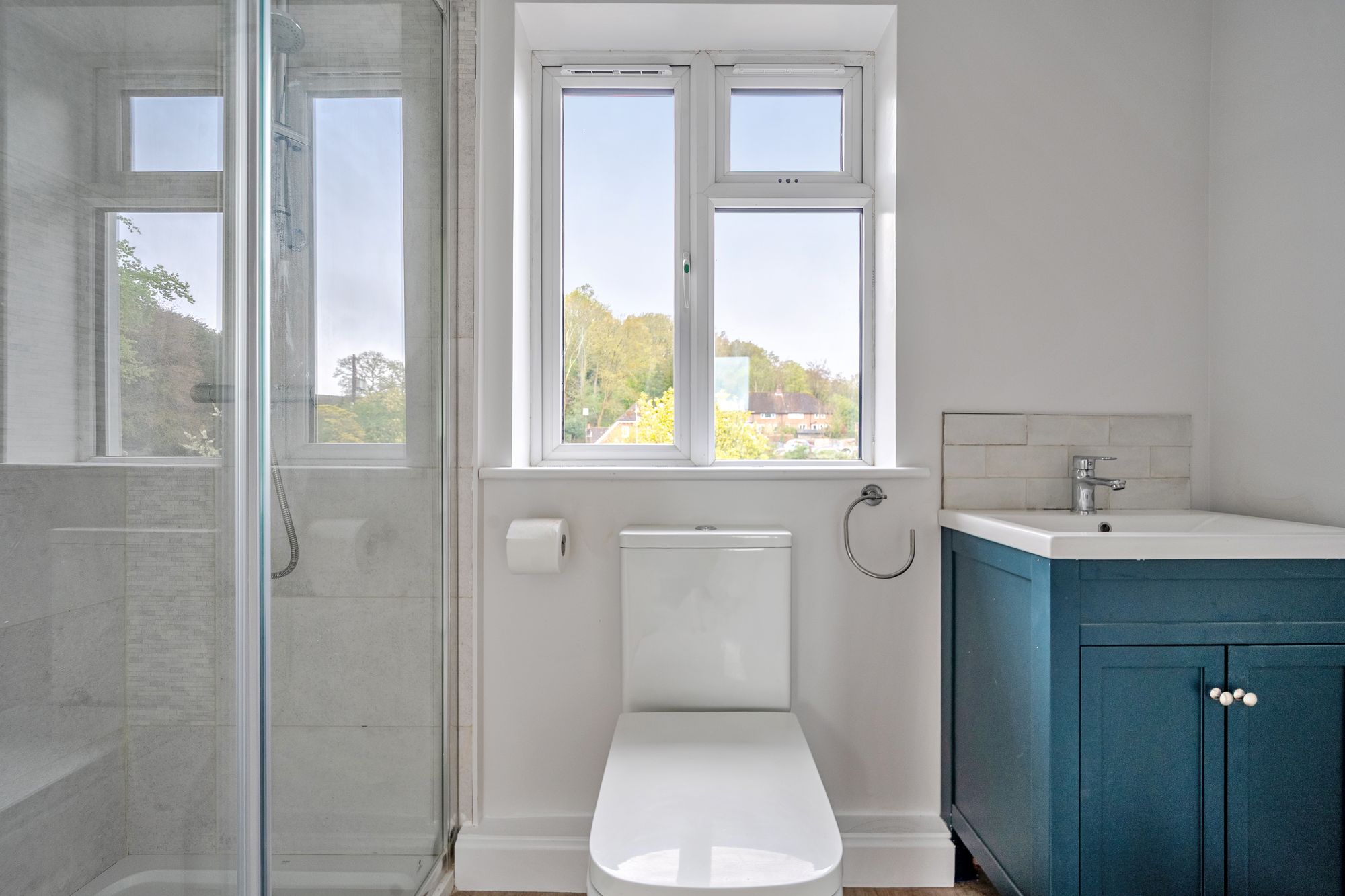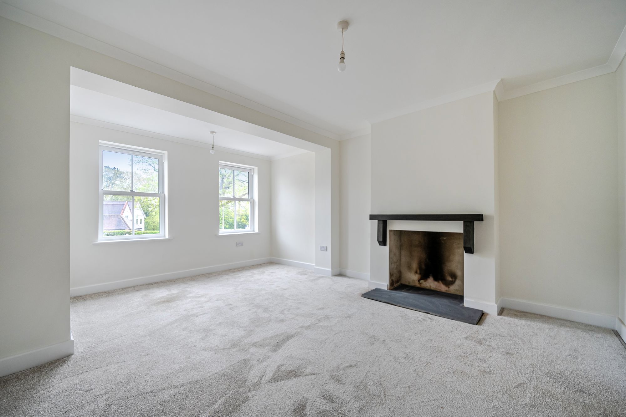 Upstairs, the first floor offers a spacious double bedroom with sash windows and a feature fireplace, a further bedroom, and a beautifully finished family bathroom. A second staircase leads to the principal bedroom suite, occupying the top floor, complete with Velux windows, an en-suite shower room and elevated views across the surrounding countryside and village green.
