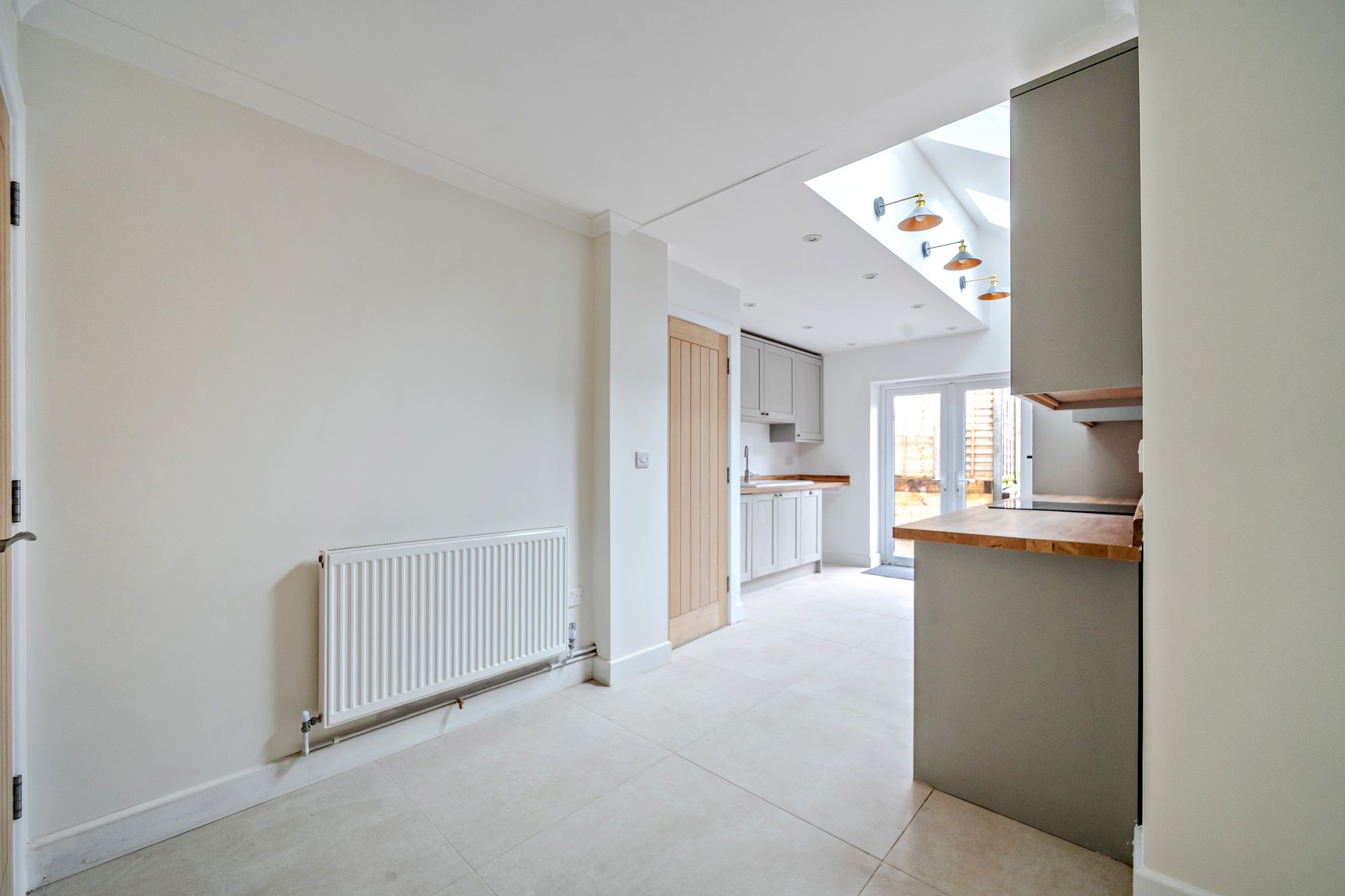 Upon entering via the side entrance, a welcoming hallway provides access to a useful storage cupboard and a well-appointed downstairs cloakroom. To one side, the sitting room is a particularly inviting space, enhanced by newly installed double glazed sash windows and centred around an open fireplace. To the opposite side, the heart of the home is the impressive open-plan kitchen/dining room. Recently refitted to a high standard, this space is flooded with natural light thanks to skylights and French doors opening directly onto the patio terrace. The thoughtful extension has created an excellent area for both everyday living and entertaining, with a seamless connection to the outdoor space.