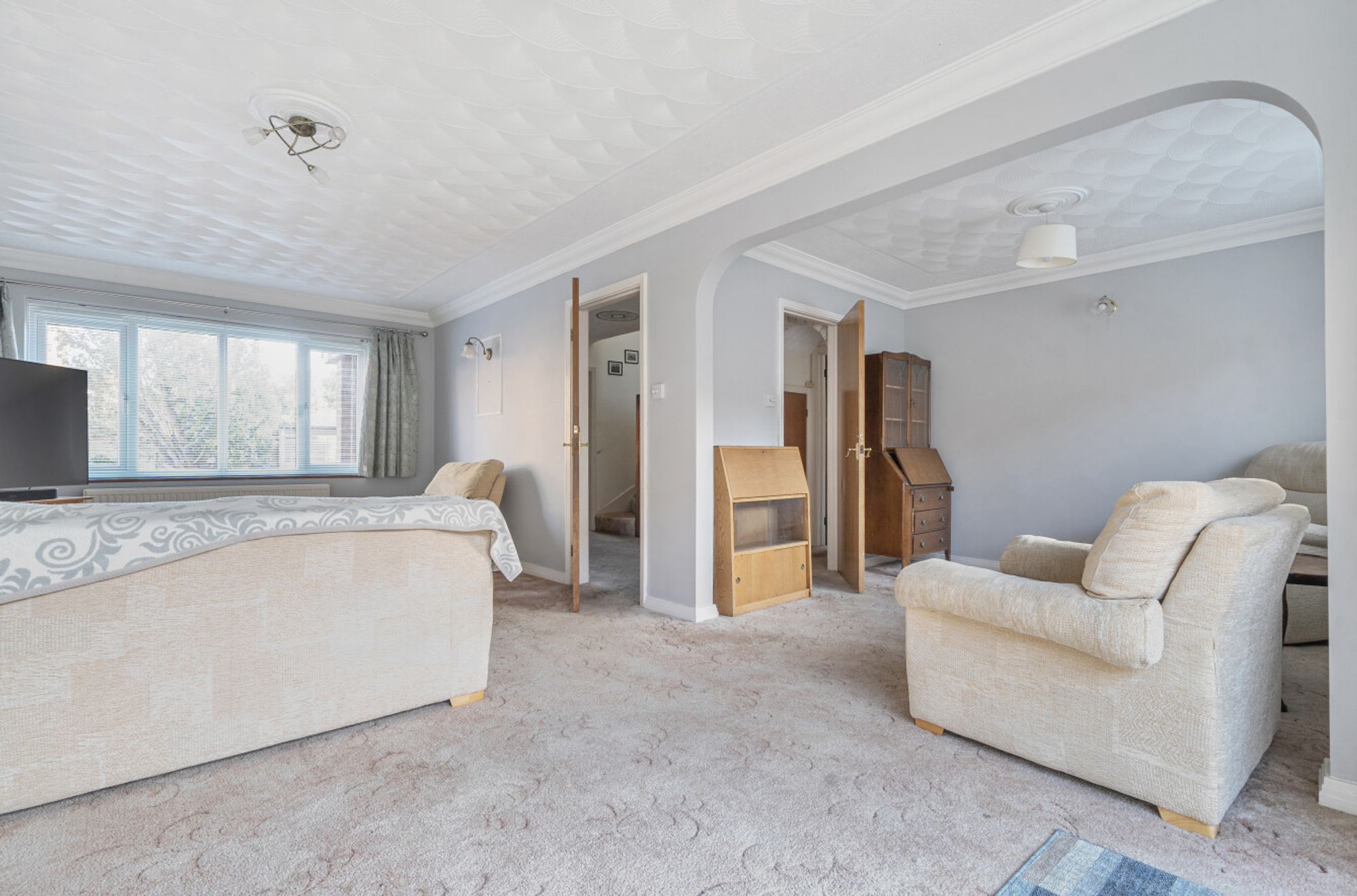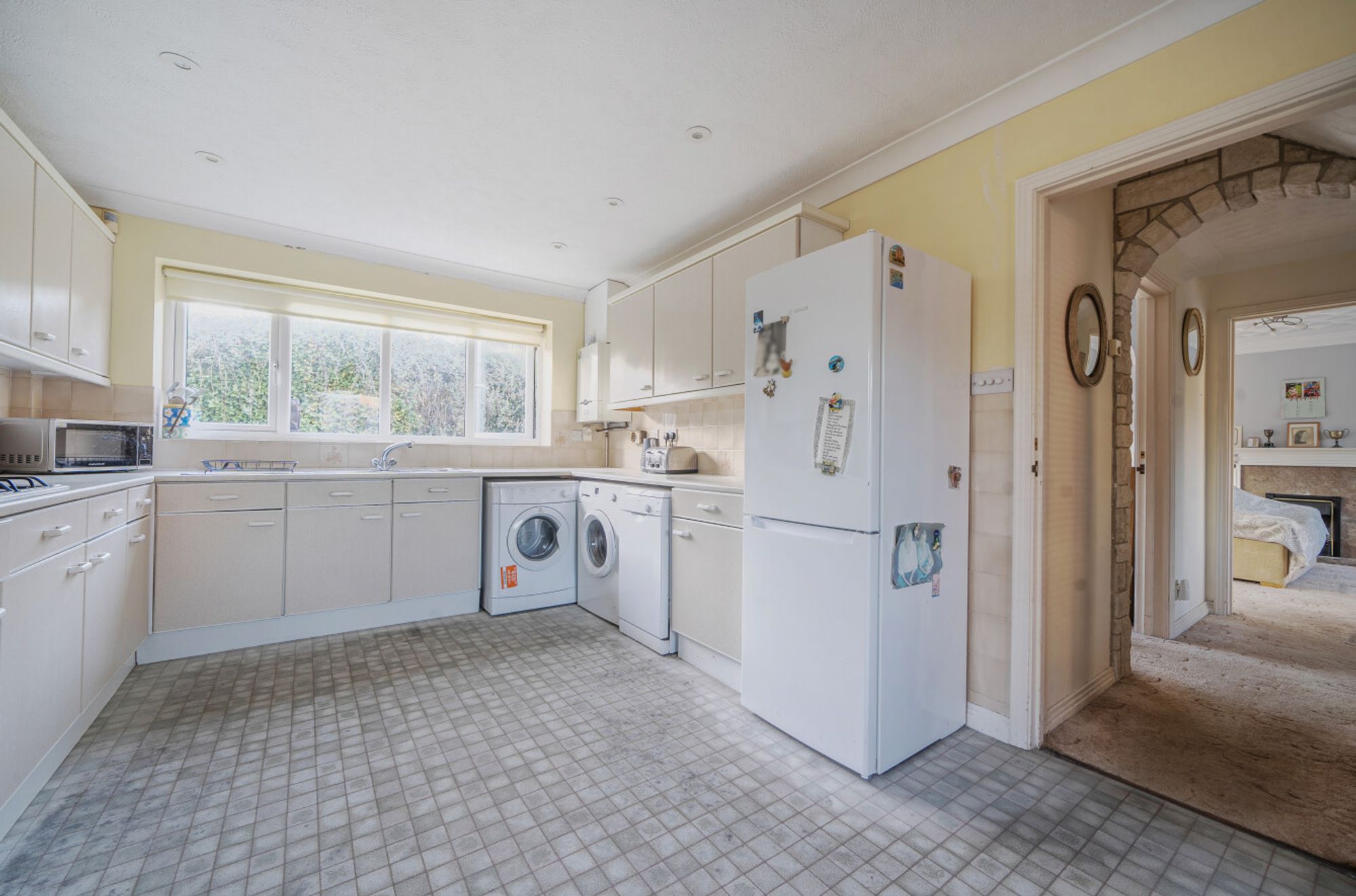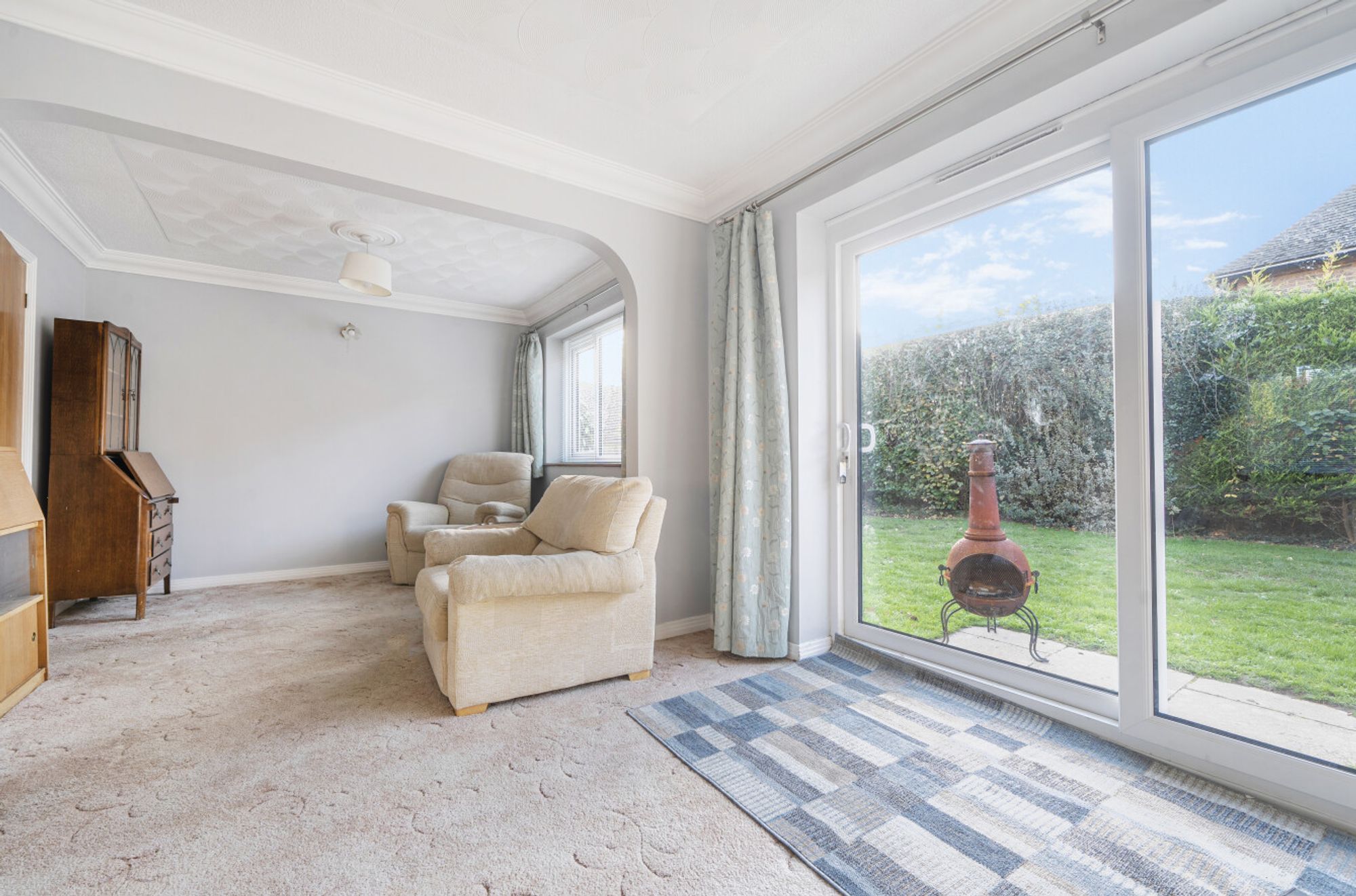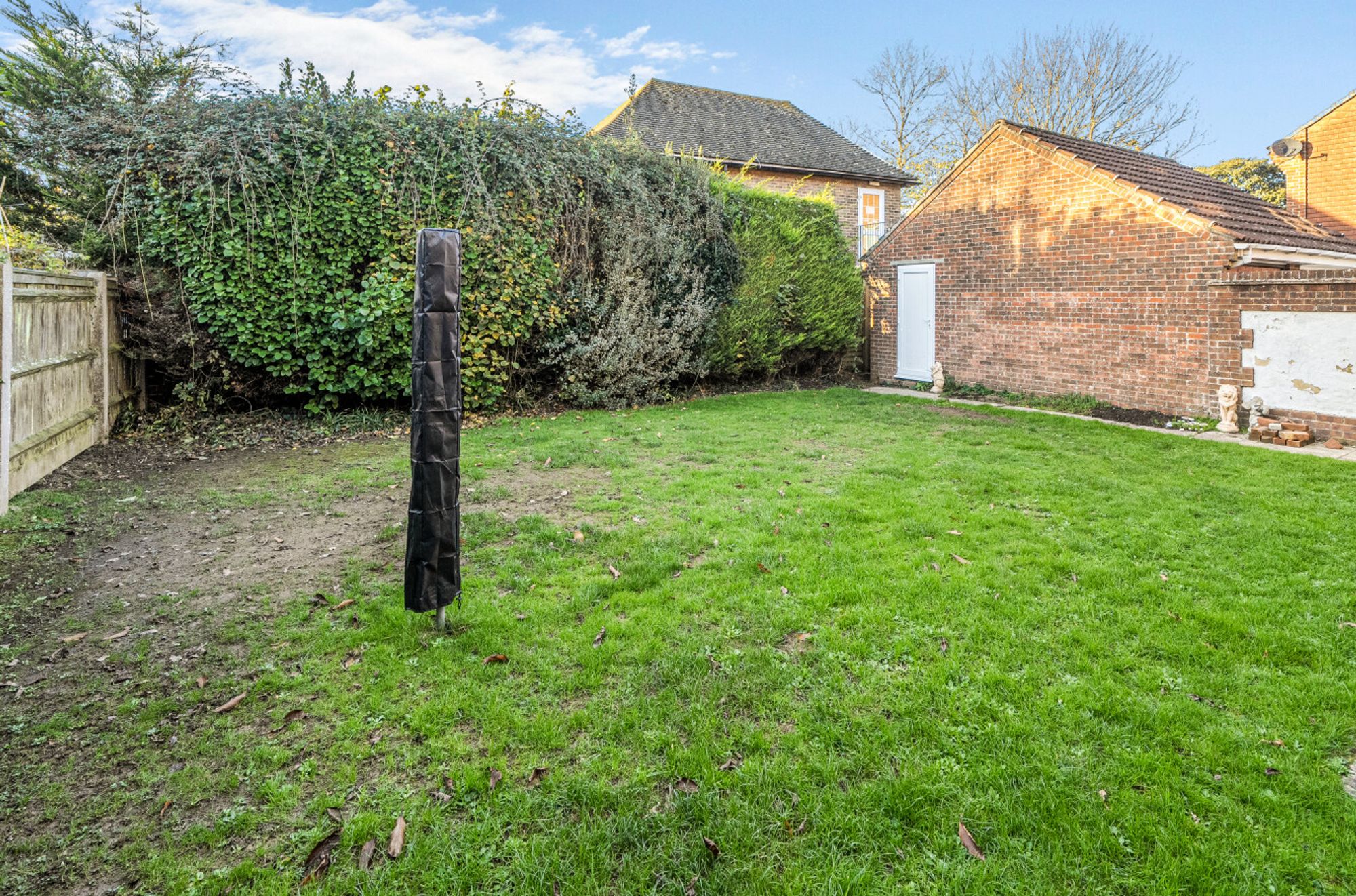 Outside, the garden is mainly laid to lawn, there is a separate garage to the side of the house with an off-street parking space.