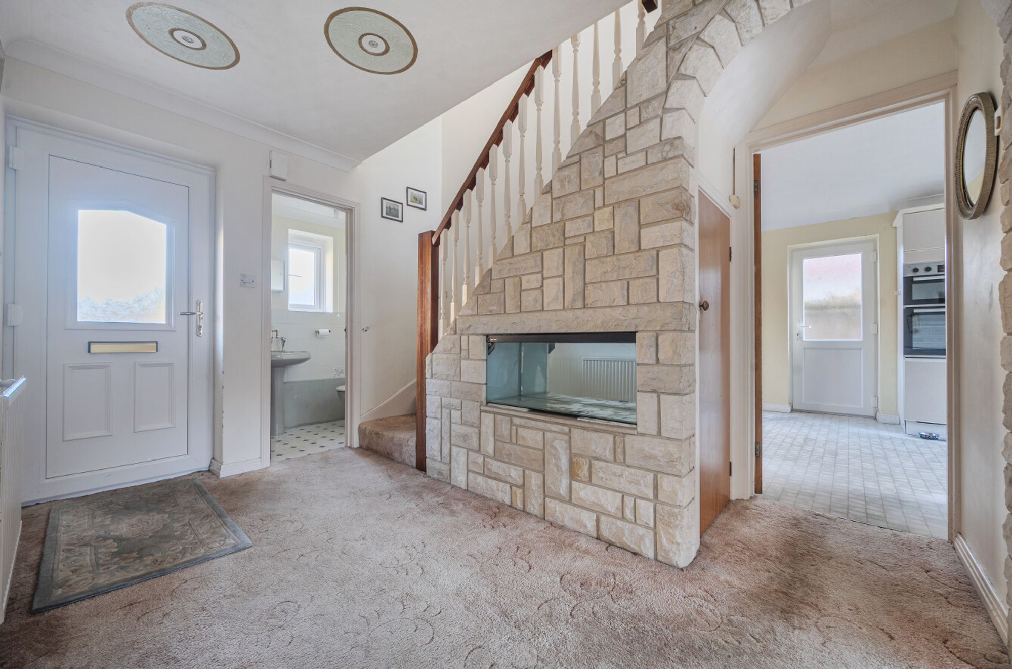 The front door opens onto a wide hallway with staircase to the first floor, doors to all ground floor rooms and an under stairs storage cupboard. The ‘L’ shaped reception room is double aspect with French doors opening to the garden and a feature fireplace. The kitchen is a large double aspect room with a comprehensive range of wall and base units with ample work top space and a large dining area. There are windows to the front and the rear of the kitchen and a half glazed door to the side of the house. Also on the ground floor is a separate cloakroom.