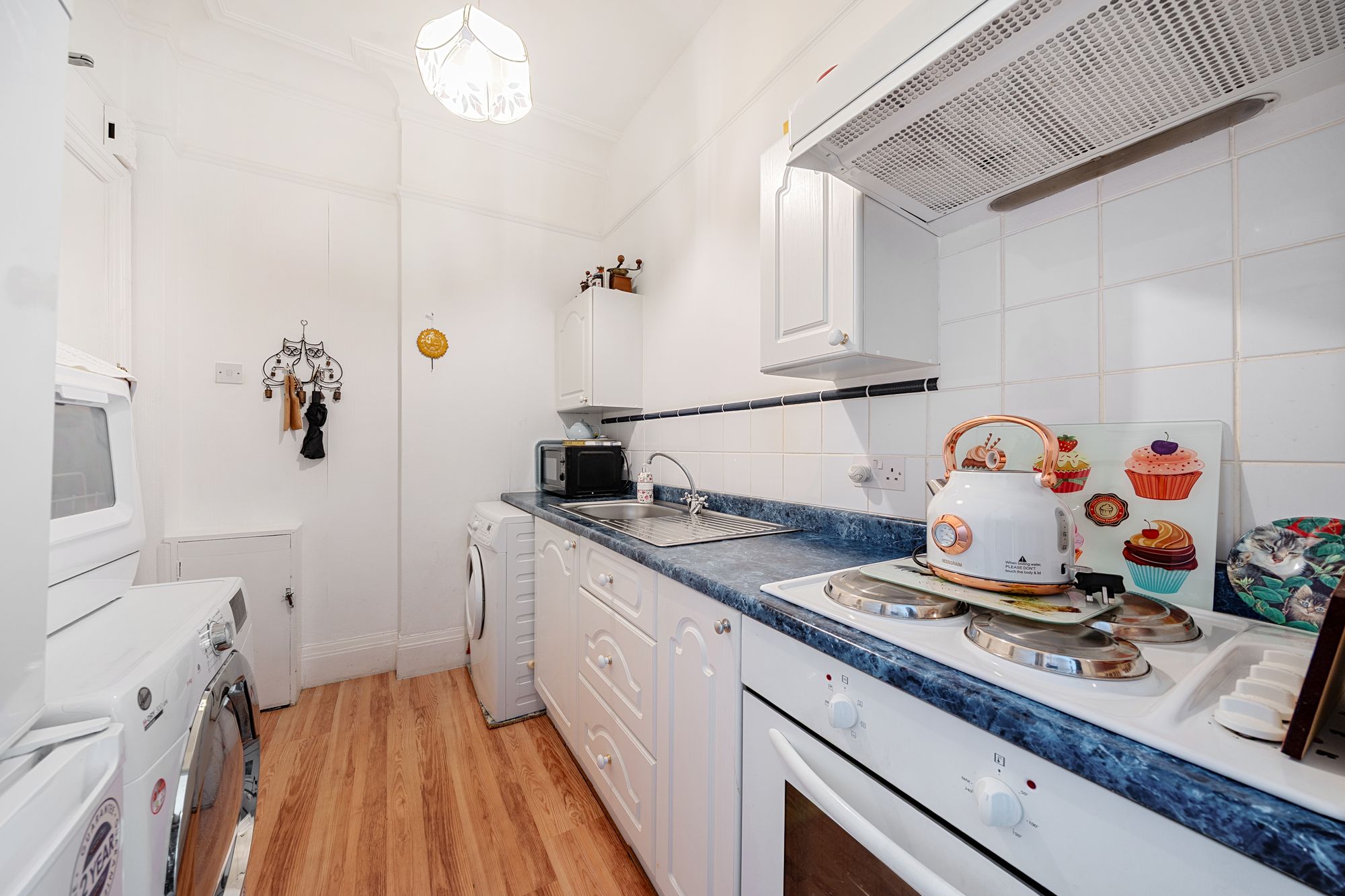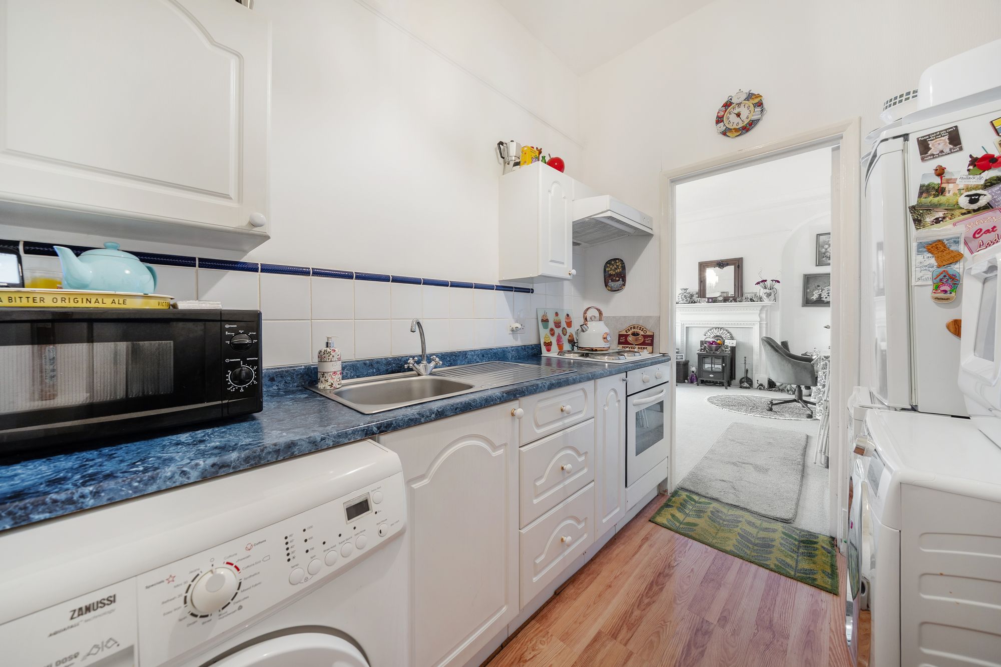 The kitchen is complemented by blue countertops and classic white cabinetry. The kitchen flows into the living area. The bedroom has high ceilings and views over the communal rear garden with a fitted en-suite shower room.