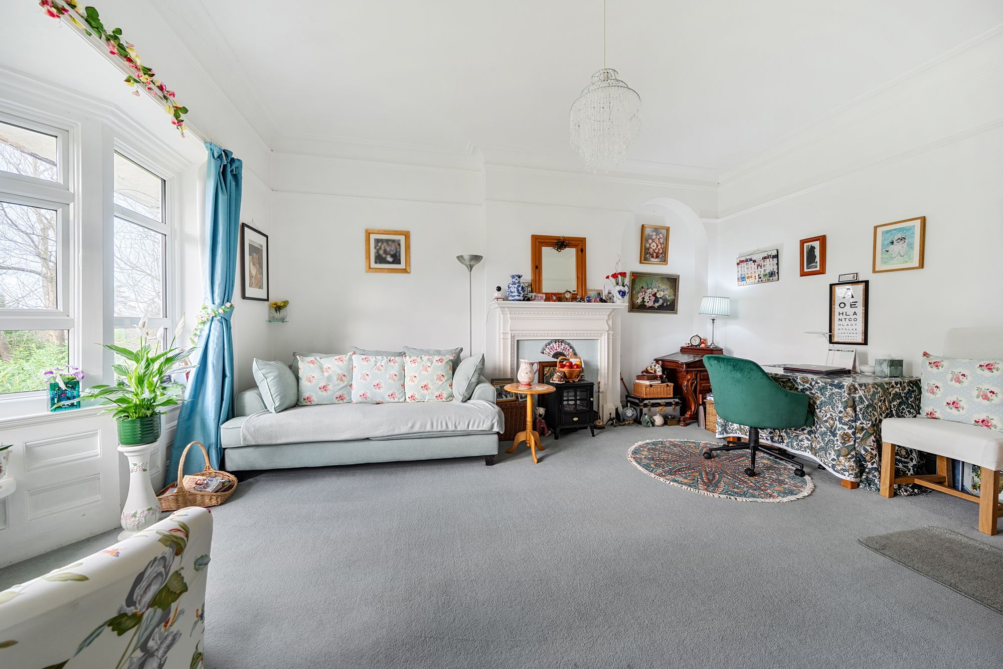 This beautifully presented one-bedroom flat combines period charm with modern comfort, offering an inviting and light-filled living space. The property is thoughtfully arranged, featuring a generous reception room adorned with large oriel bay window that allow abundant natural light to flood the space, highlighting elegant decorative features and providing tranquil views of the landscaped communal gardens. The living area is centred around a charming feature fireplace with a decorative ceiling, creating a warm and welcoming atmosphere, while a cosy seating arrangement and tasteful floral décor enhance the sense of relaxation and homeliness.