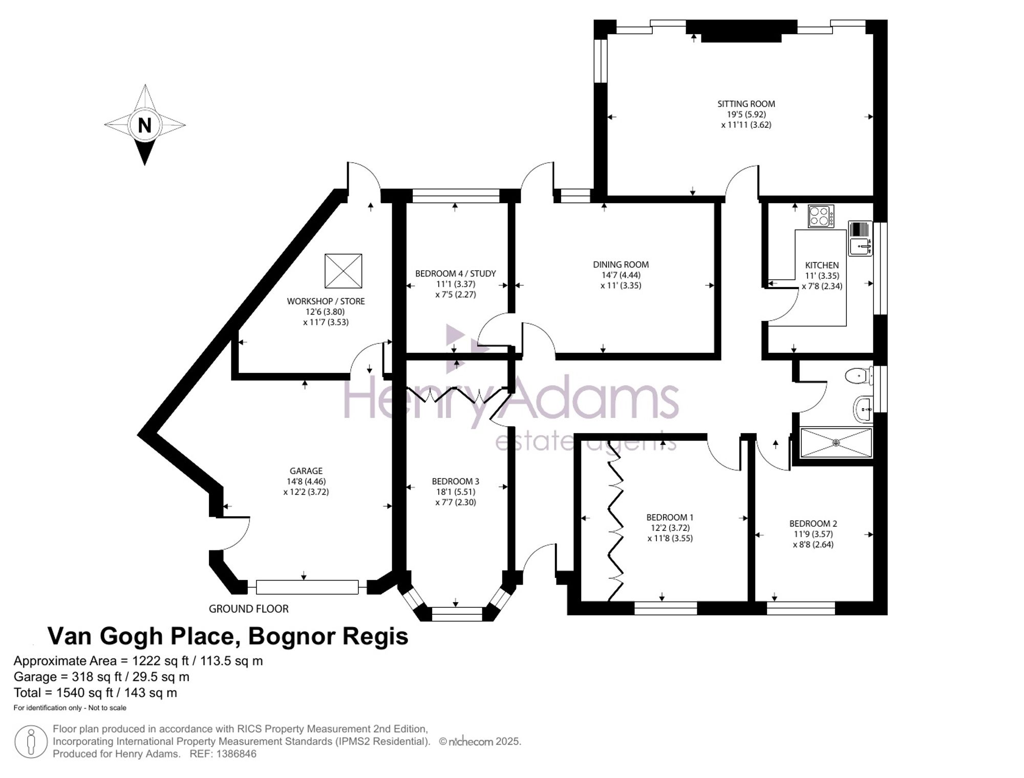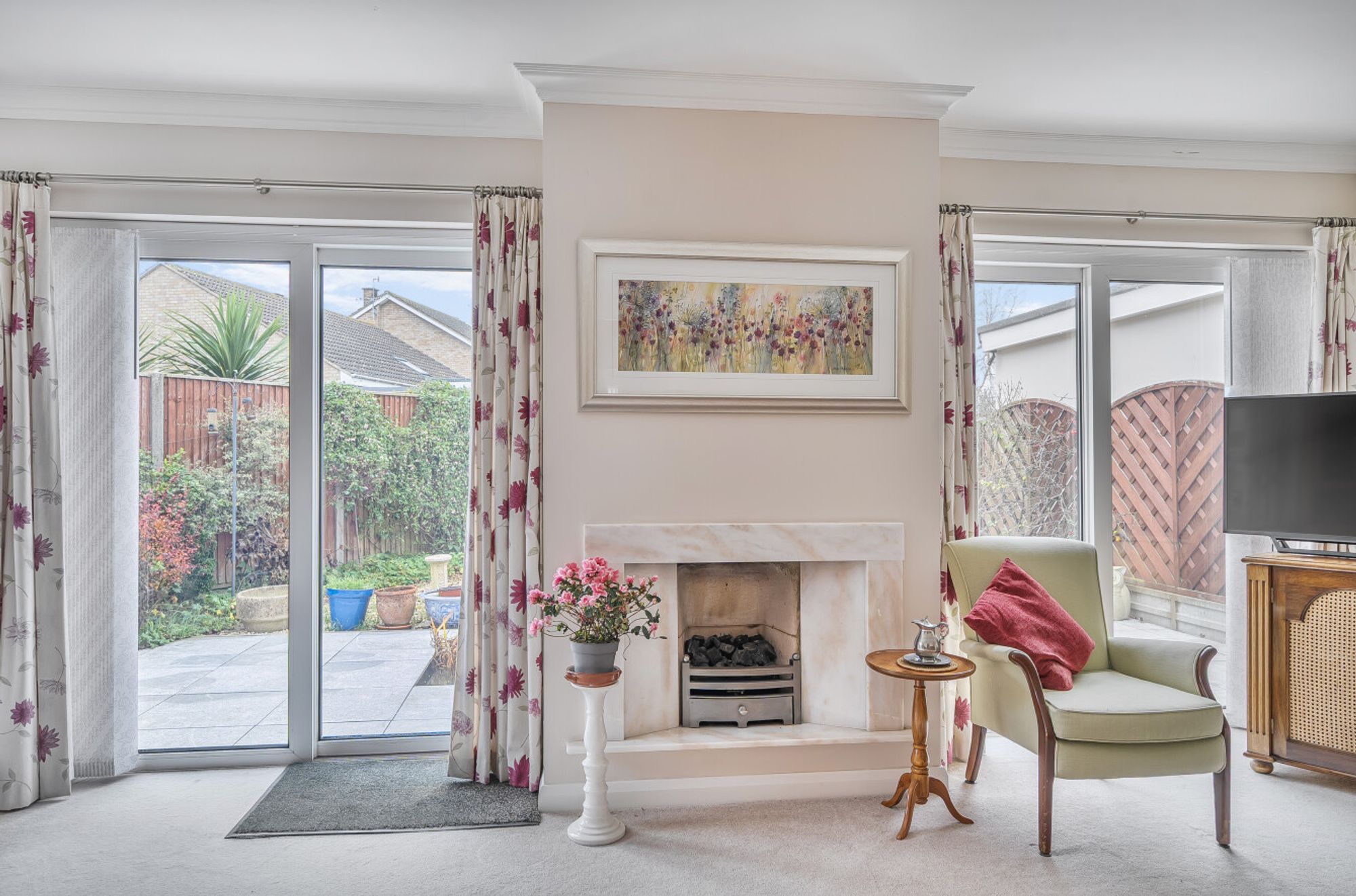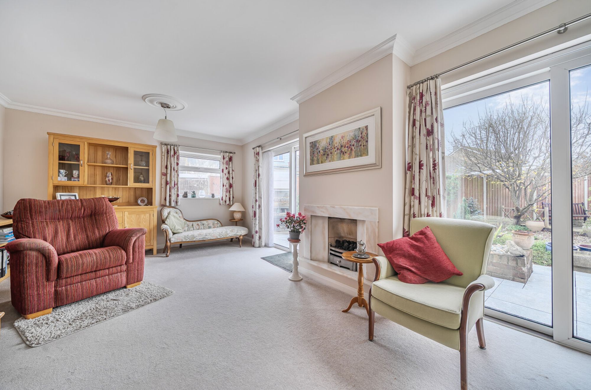 The front door opens to an ‘L’ shaped hallway leading to all rooms. The spacious reception room is double aspect featuring two double French doors opening to the garden, a side window and coving. The kitchen consists of a comprehensive range of wall and base units with ample worktops, an integral hob and oven, space and plumbing for white goods and a tiled floor. The separate dining room with glazed door opens to the patio. The first bedroom has a whole wall of fitted wardrobes and a large casement window. There are three further bedrooms one presently equipped as a study and a large family shower room.