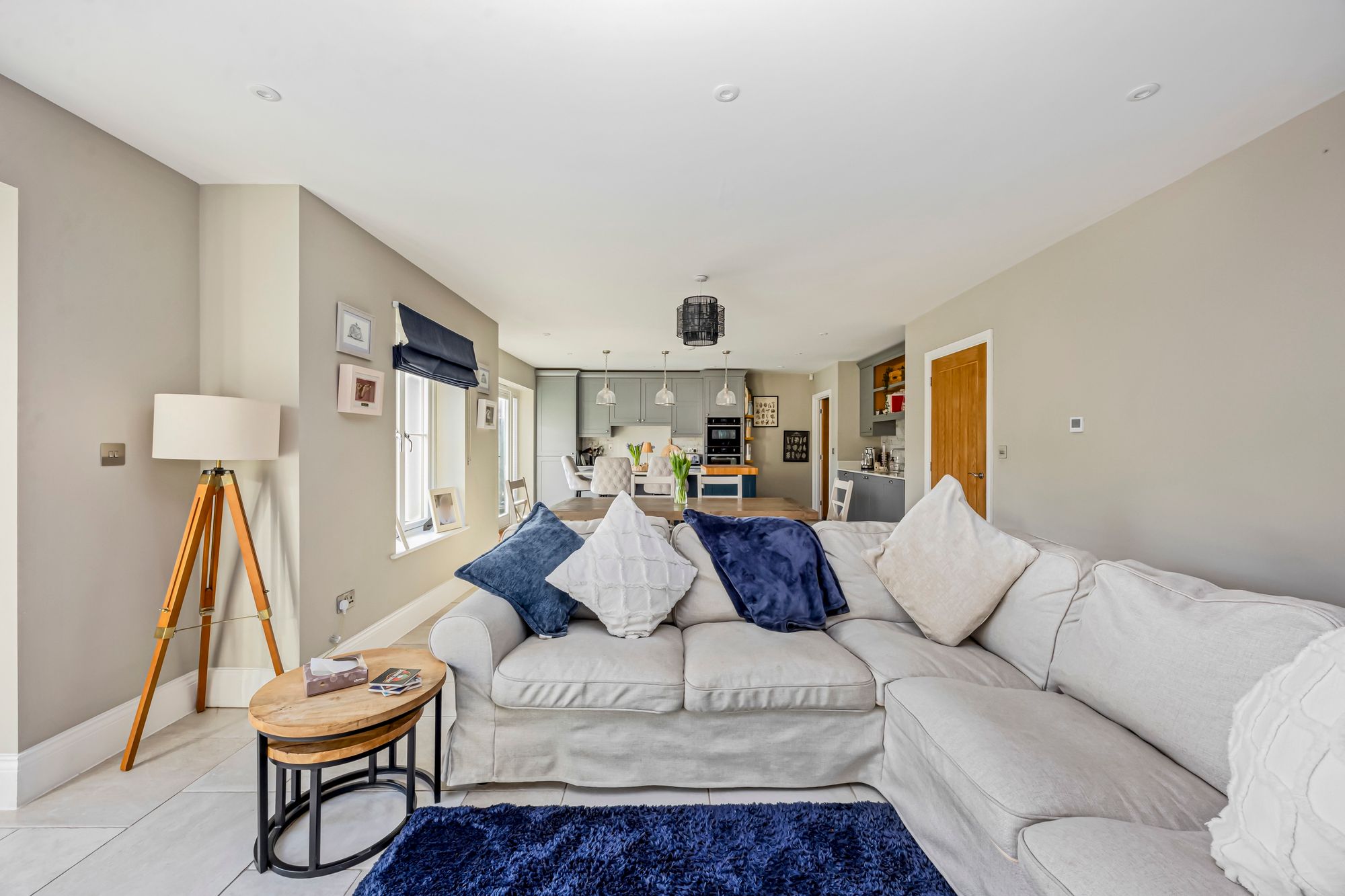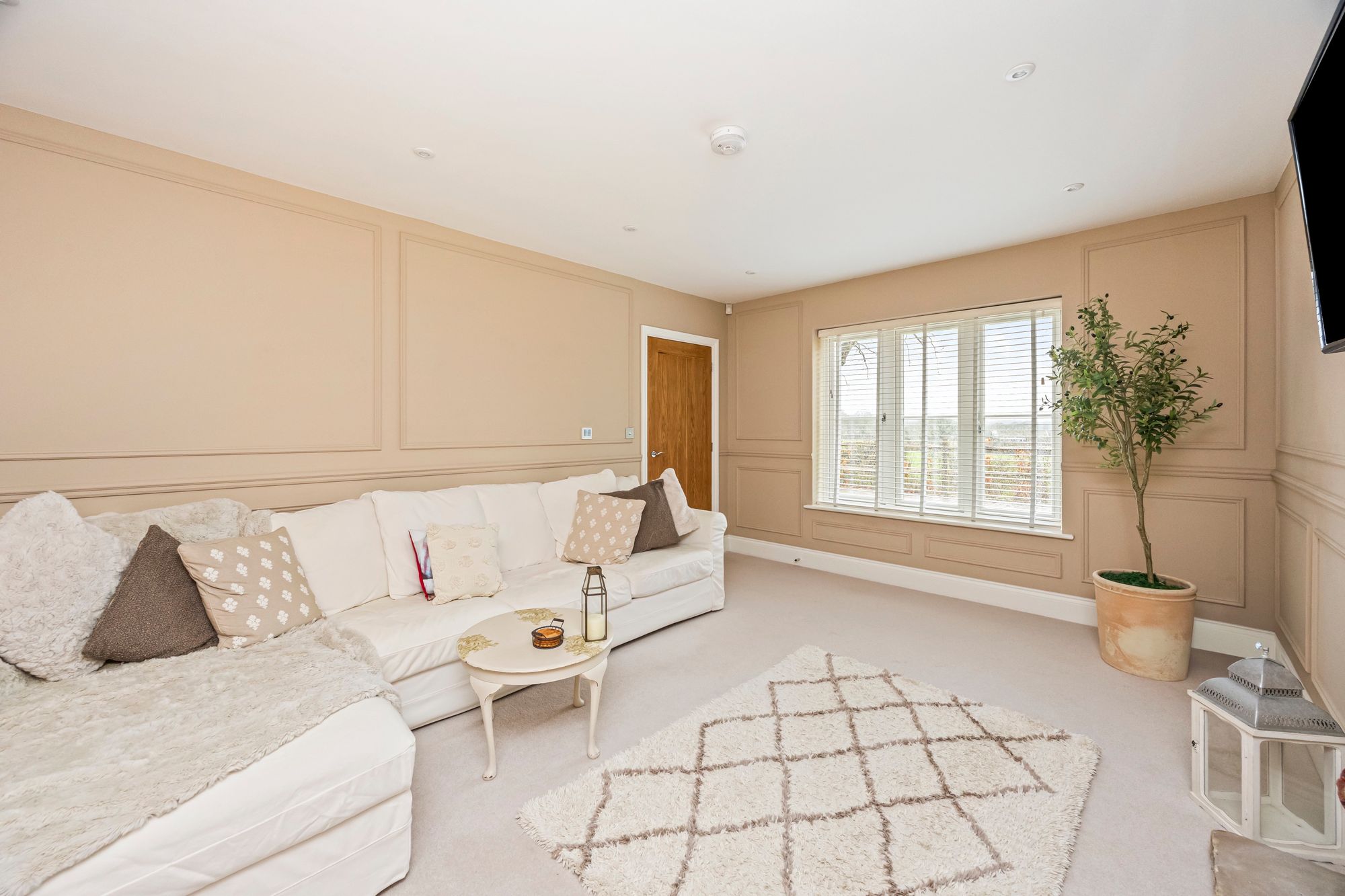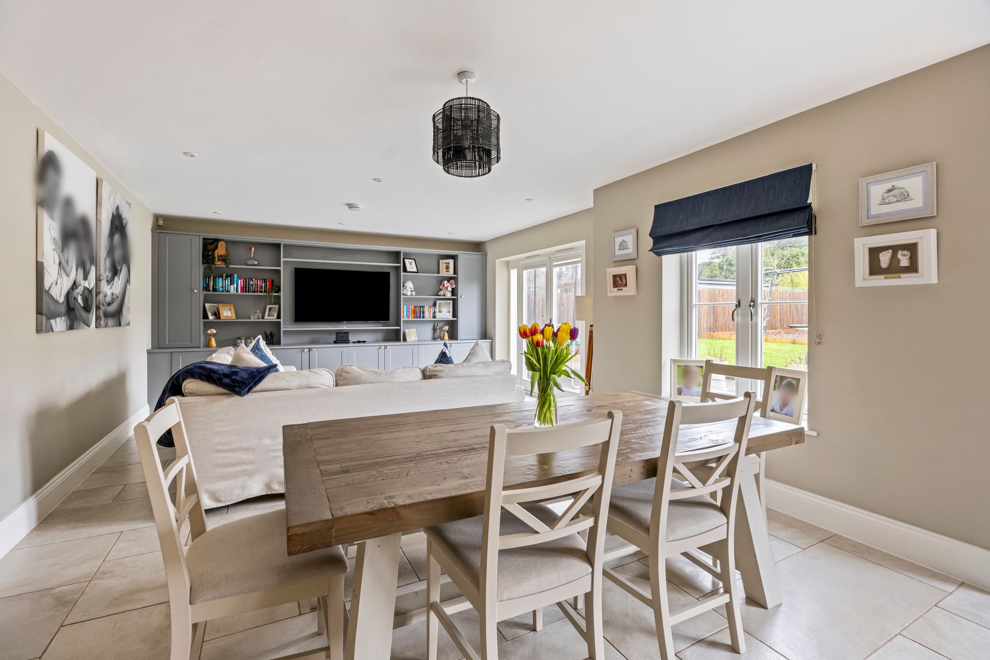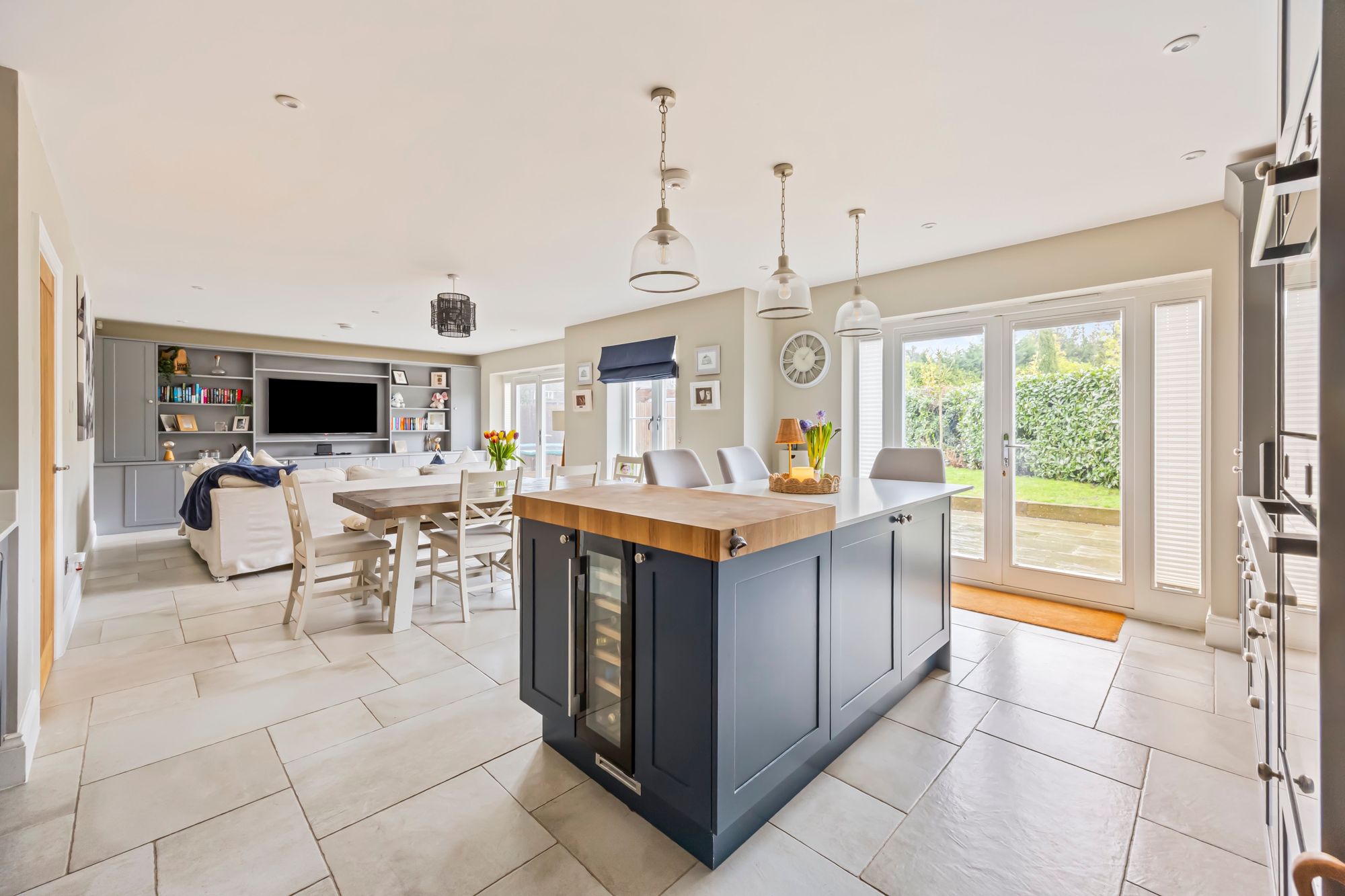 To the ground floor - a generously proportioned reception hallway welcomes you, it provides a light and airy feel with a tiled floor that runs through leading to a stunning and impressive open plan kitchen/dining/living room. This fabulous open space measures 32’ and includes a kitchen that has a range of complementing wall and base cabinets with quartz work surfaces running through, there is a selection of high-end integrated appliances including a double oven, wine fridge, a dishwasher and an induction hob. There is also a sociable sit up for breakfast bar which is ideal for busy families. The tiled floor runs through with underfloor heating and provides ample space for a dining and sitting room set up, the current owners have thoughtfully installed further cupboards and shelving as part of a media wall storage. Further space to the ground floor includes a fabulous sitting room which has a feature fireplace and decorative panelling to the walls. Also of note to the ground floor is a separate study/home office, utility room and cloakroom.