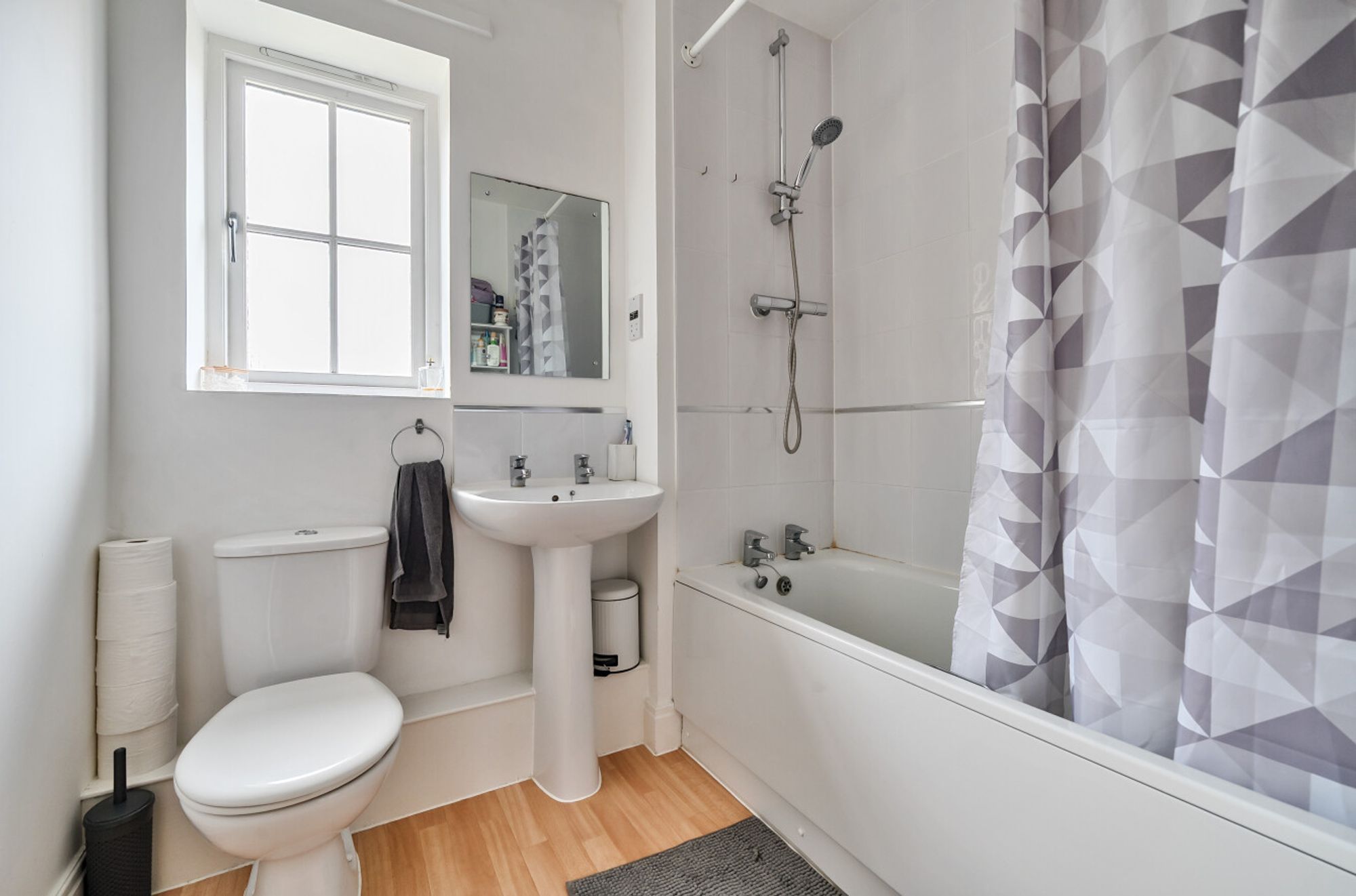 There are two generously sized double bedrooms, both enjoying a pleasant outlook to the front. The contemporary bathroom is fitted with a panelled bath and overhead shower, a low-level WC, and a pedestal wash hand basin. The property also benefits from gas-fired central heating via radiators, ensuring comfort throughout the year.