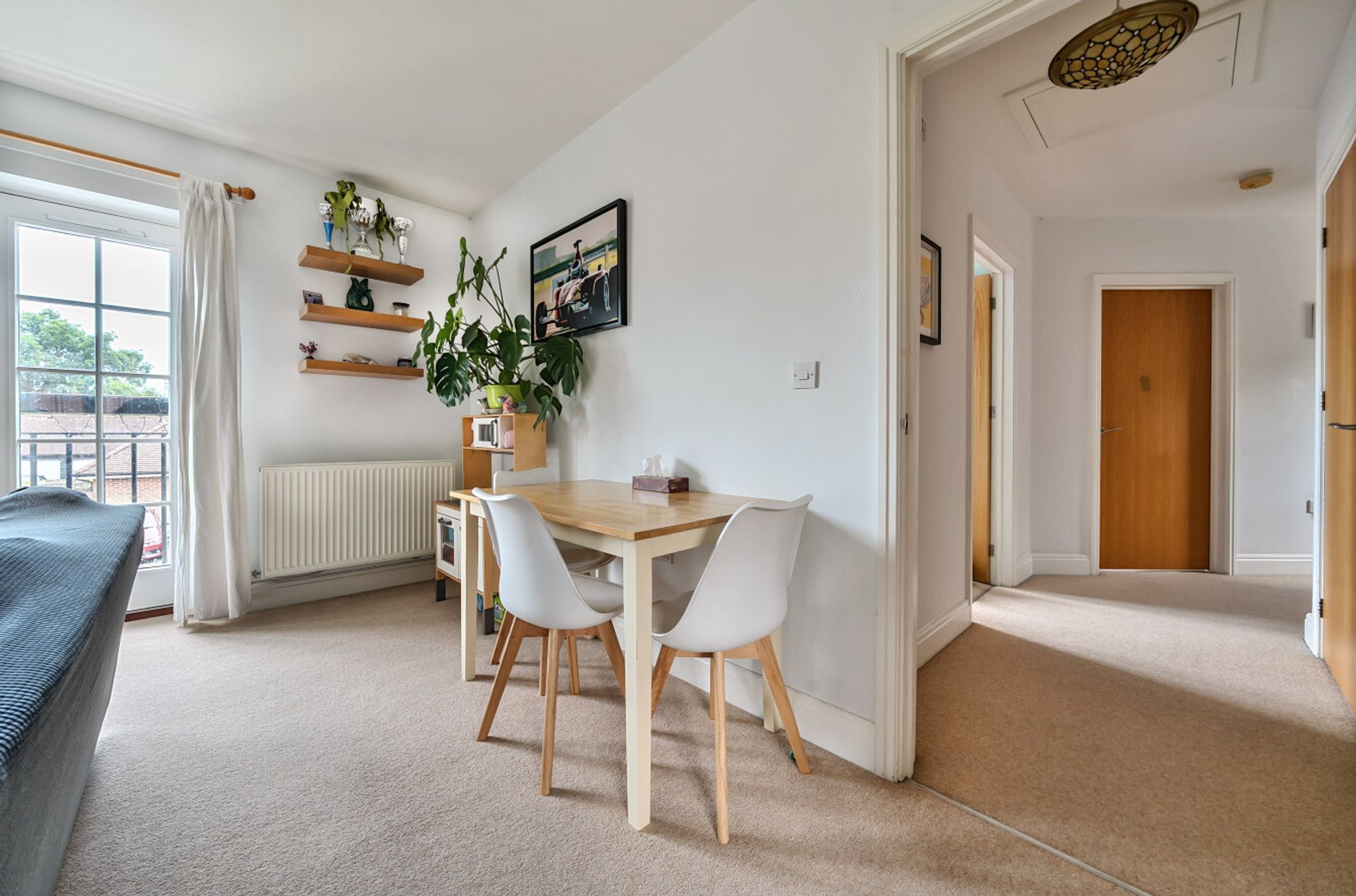 The sitting/dining room is a light and airy space, featuring double-glazed French doors that open to a charming Juliet balcony, along with an additional rear window that allows ample natural light to flow through, thanks to its dual-aspect design. The sitting area seamlessly connects to a modern, well-appointed kitchen, which offers a comprehensive range of fitted cupboards and drawers, a gas hob with electric fan-assisted oven, and space for a washing machine and larder-style fridge/freezer.