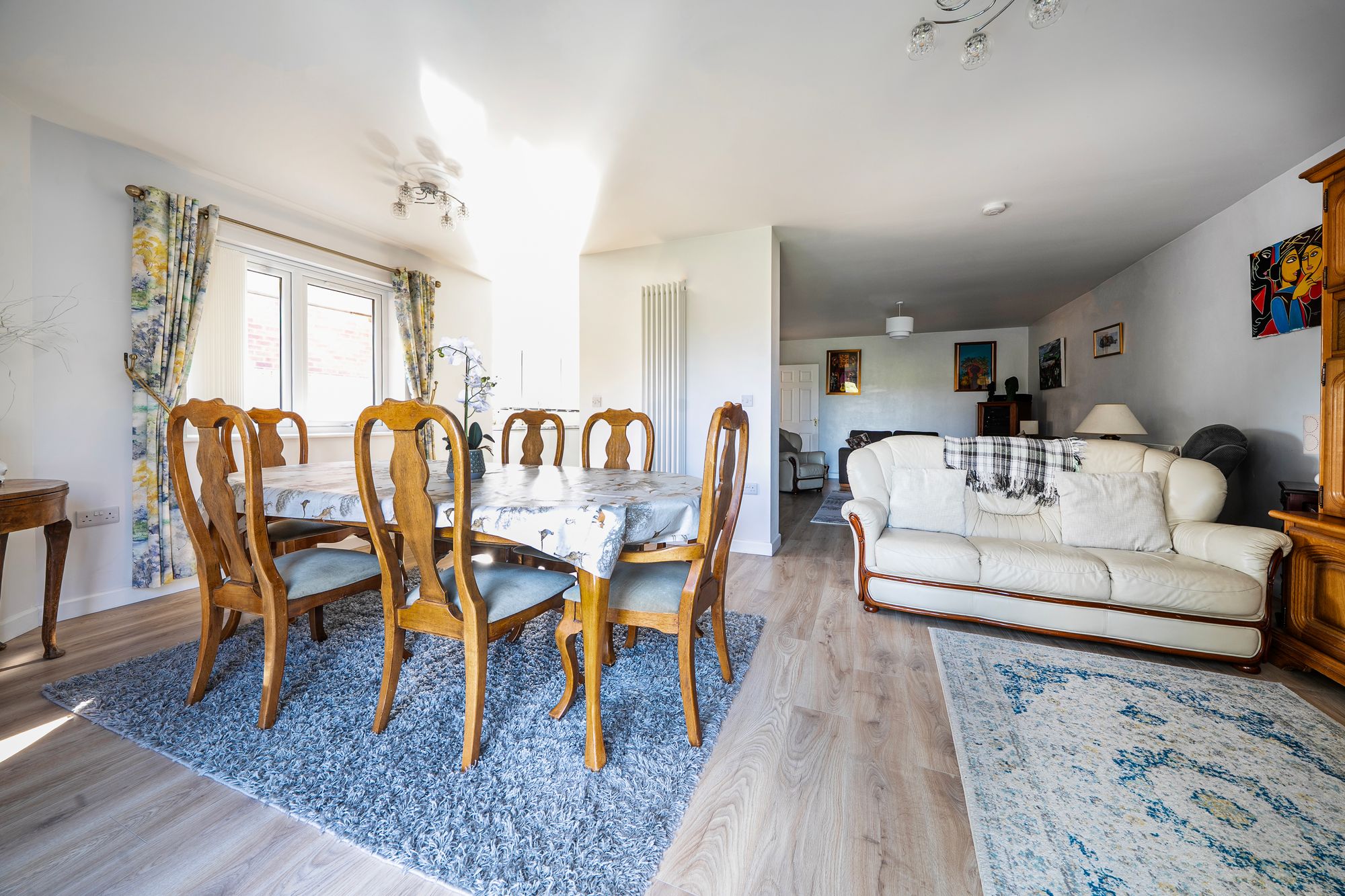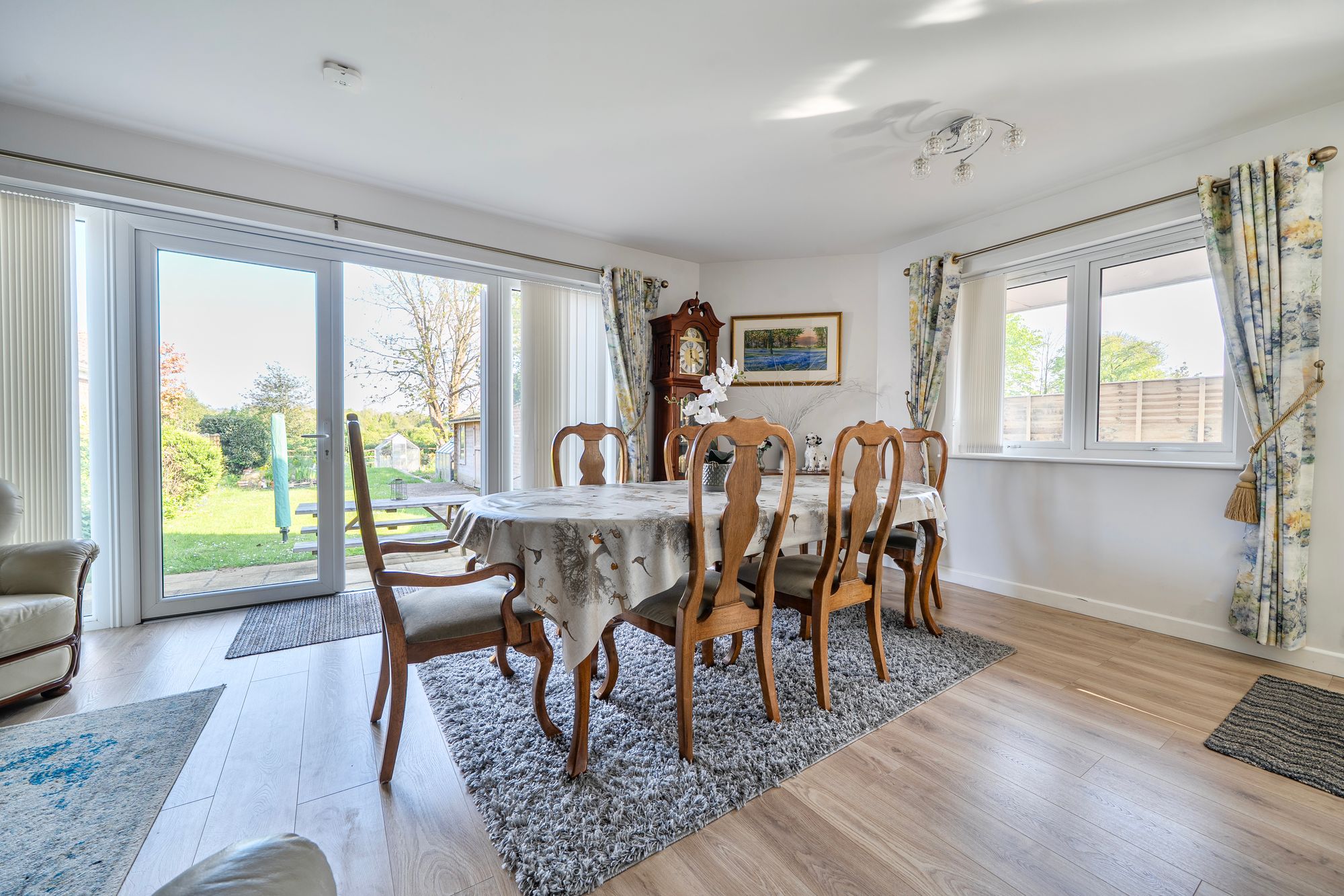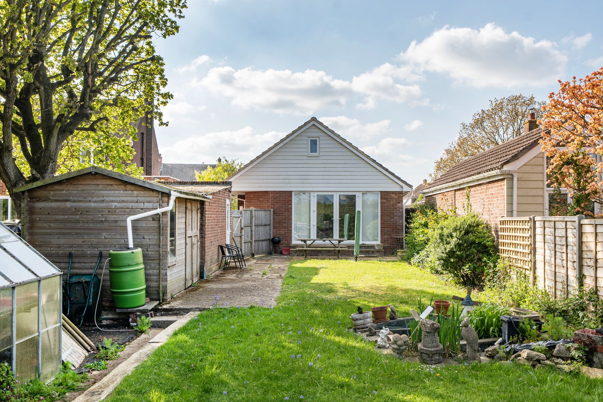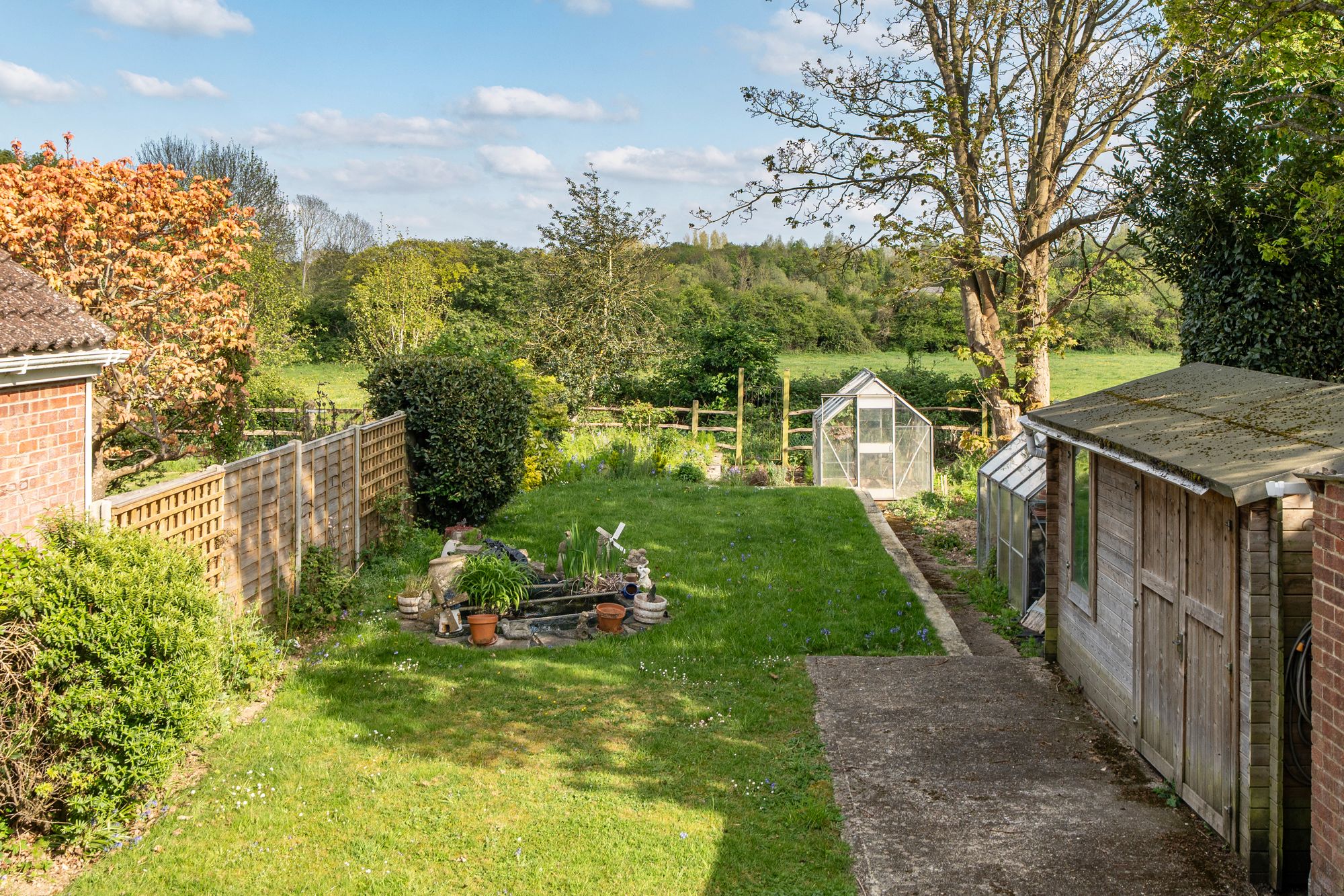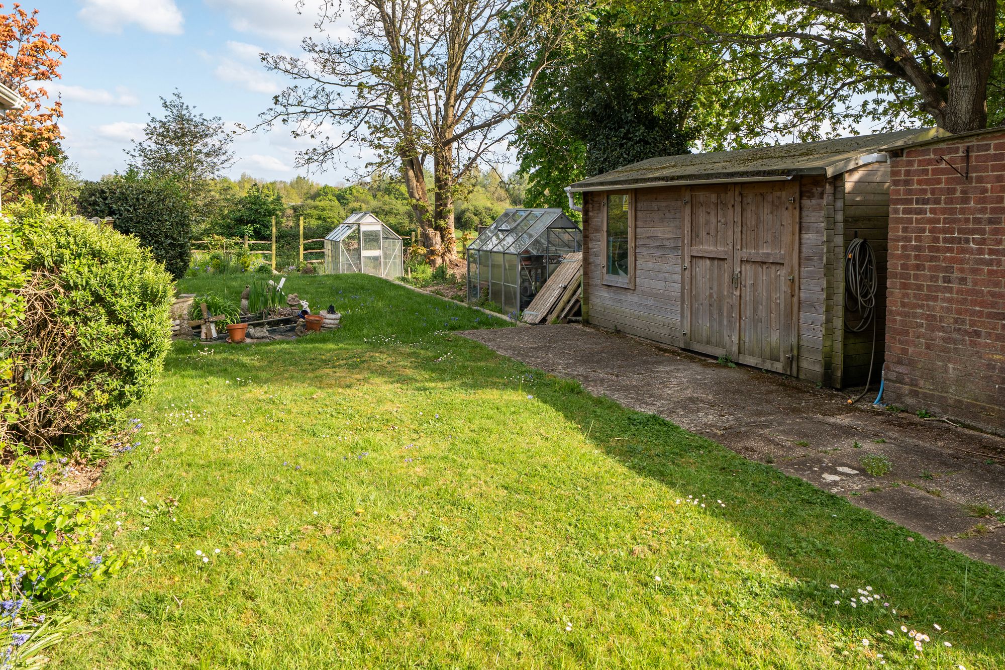 Outside, the mature rear garden is a particular highlight, backing onto open fields and offering a high degree of privacy. It is predominantly laid to lawn and features established flower beds, a greenhouse and a secure shed.