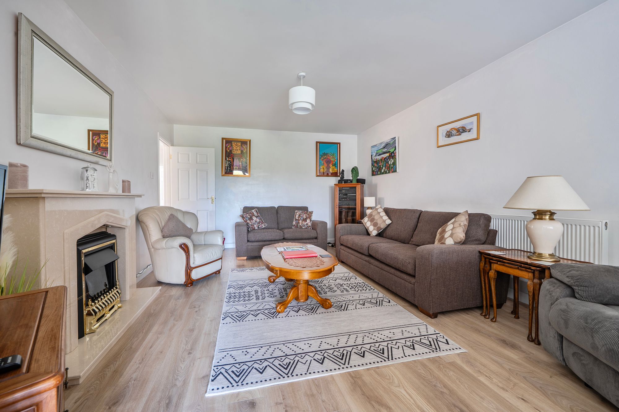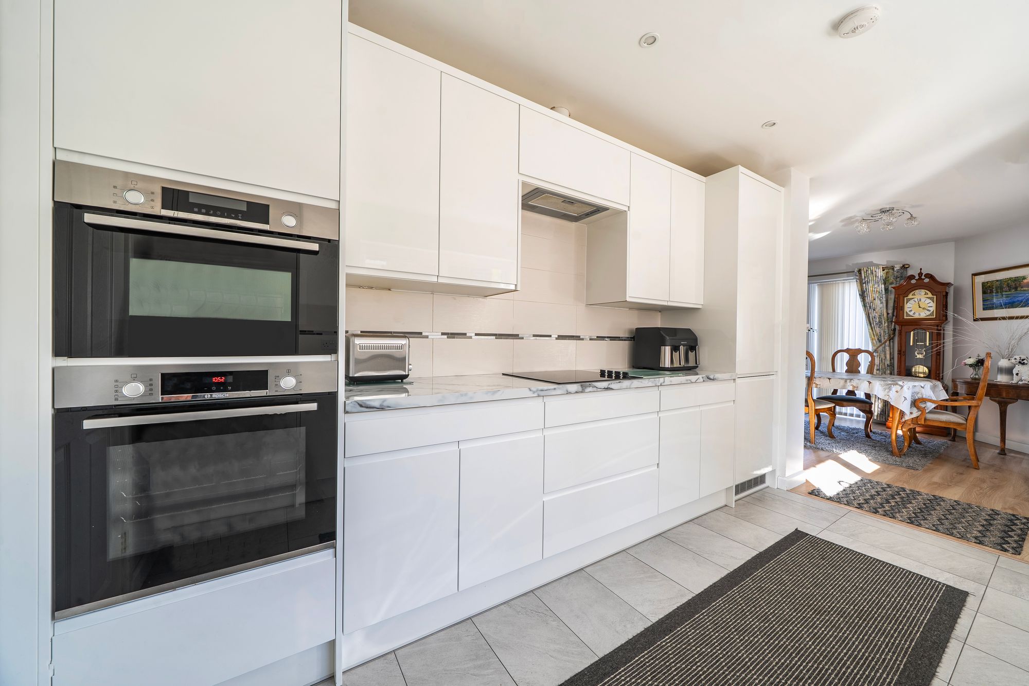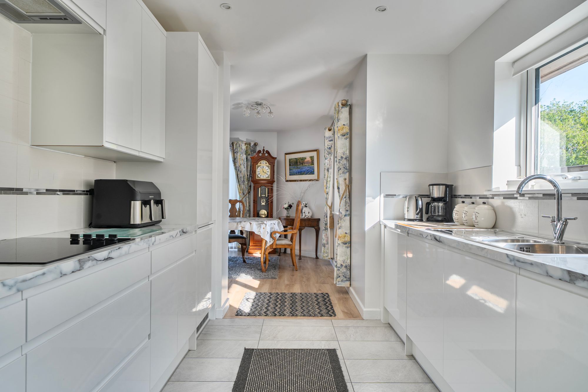 Upon entering, you are welcomed by a central hallway that provides access to the main accommodation. To the rear of the bungalow is the principal living space, including a galley-style kitchen fitted with ample high-gloss units and integrated appliances. The living room sits at the heart of the home, featuring an attractive fireplace and opening through to a dining area that enjoys views over the rear garden.