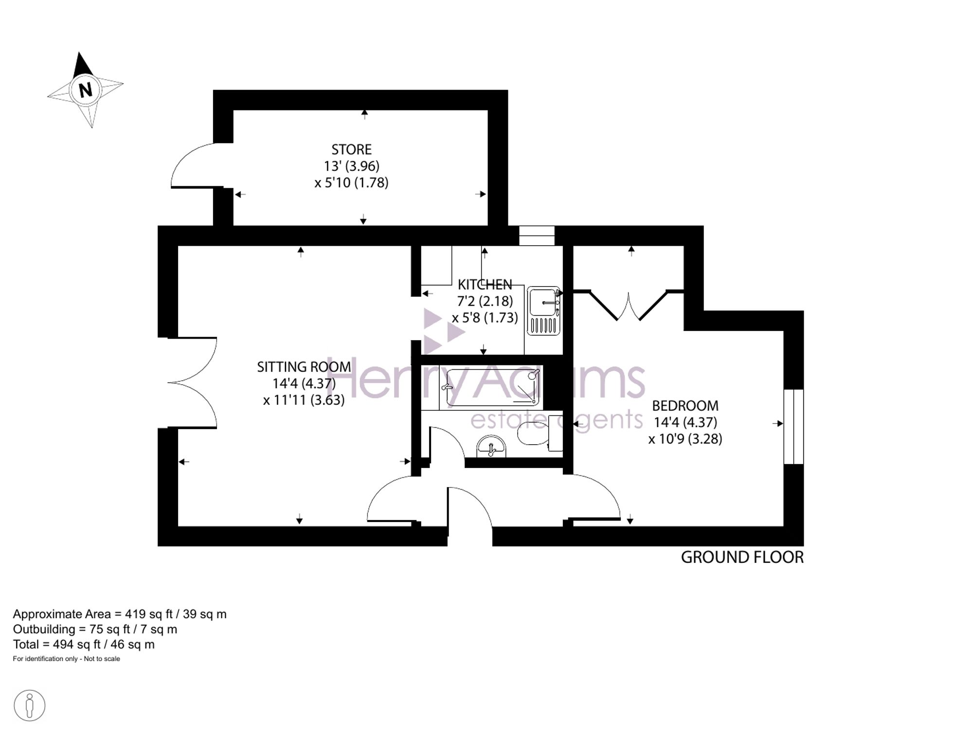 The accommodation includes a sitting room, kitchen and a double bedroom complete with a fitted wardrobe. A modern bathroom with WC and an attached large external brick store further enhance the practicality.