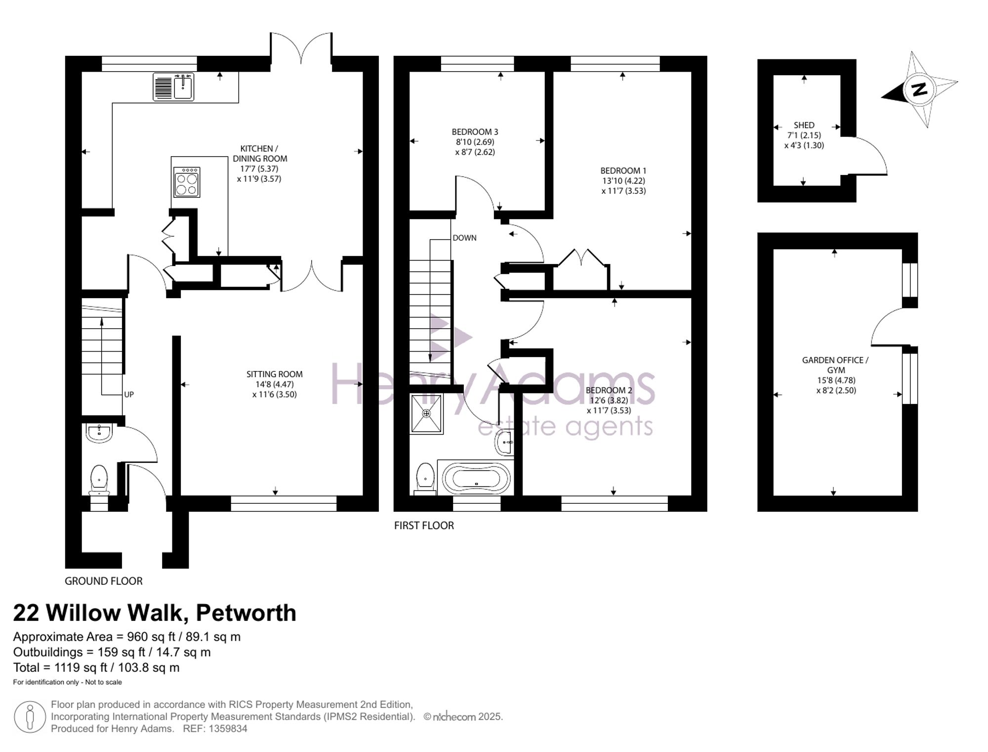 The rear garden has been designed for low-maintenance enjoyment, with a neat lawn and useful outbuildings. One of these, notably spacious, is currently utilised as a home gym but lends itself equally well to a home office or studio. Overall, 22 Willow Walk presents a ready-to-move-into home in a highly convenient and desirable location.