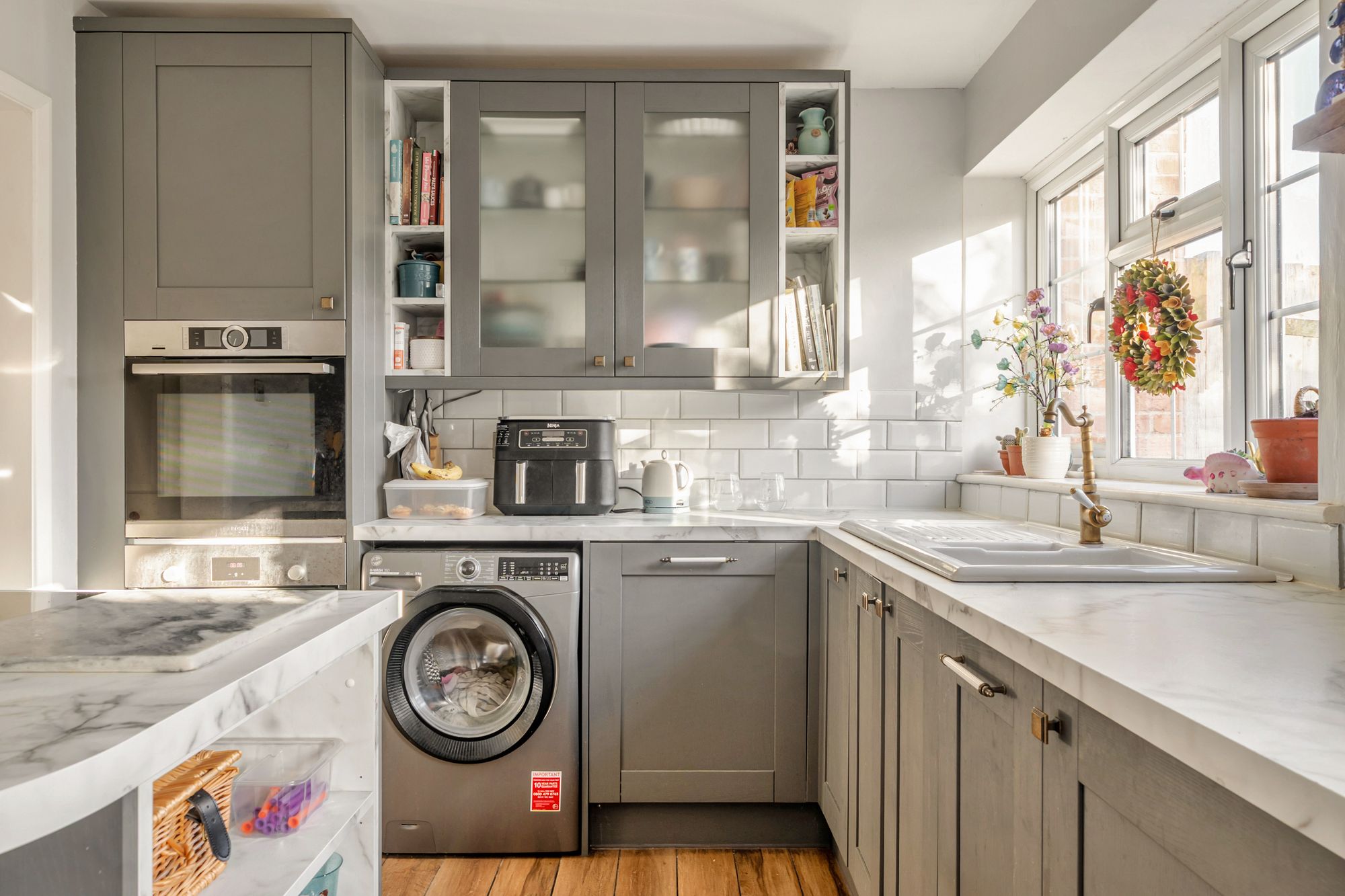 The front of the house enjoys a pleasant outlook over a communal green, with a practical porch offering space for coats and shoes. Upon entering, a cloakroom sits to the left, while the inviting sitting room lies to the right. Glazed doors connect this space to the impressive kitchen/dining room at the rear, now very much the heart of the home. This newly fitted area features well-planned cabinetry, generous countertop space, integrated appliances, including a wine cooler and French doors that open directly onto the garden, creating a seamless indoor–outdoor flow.