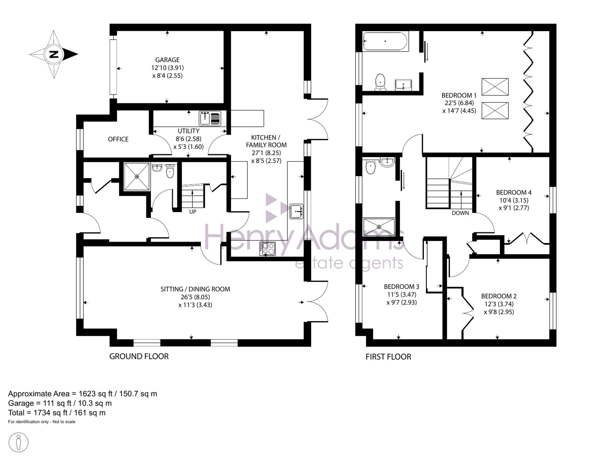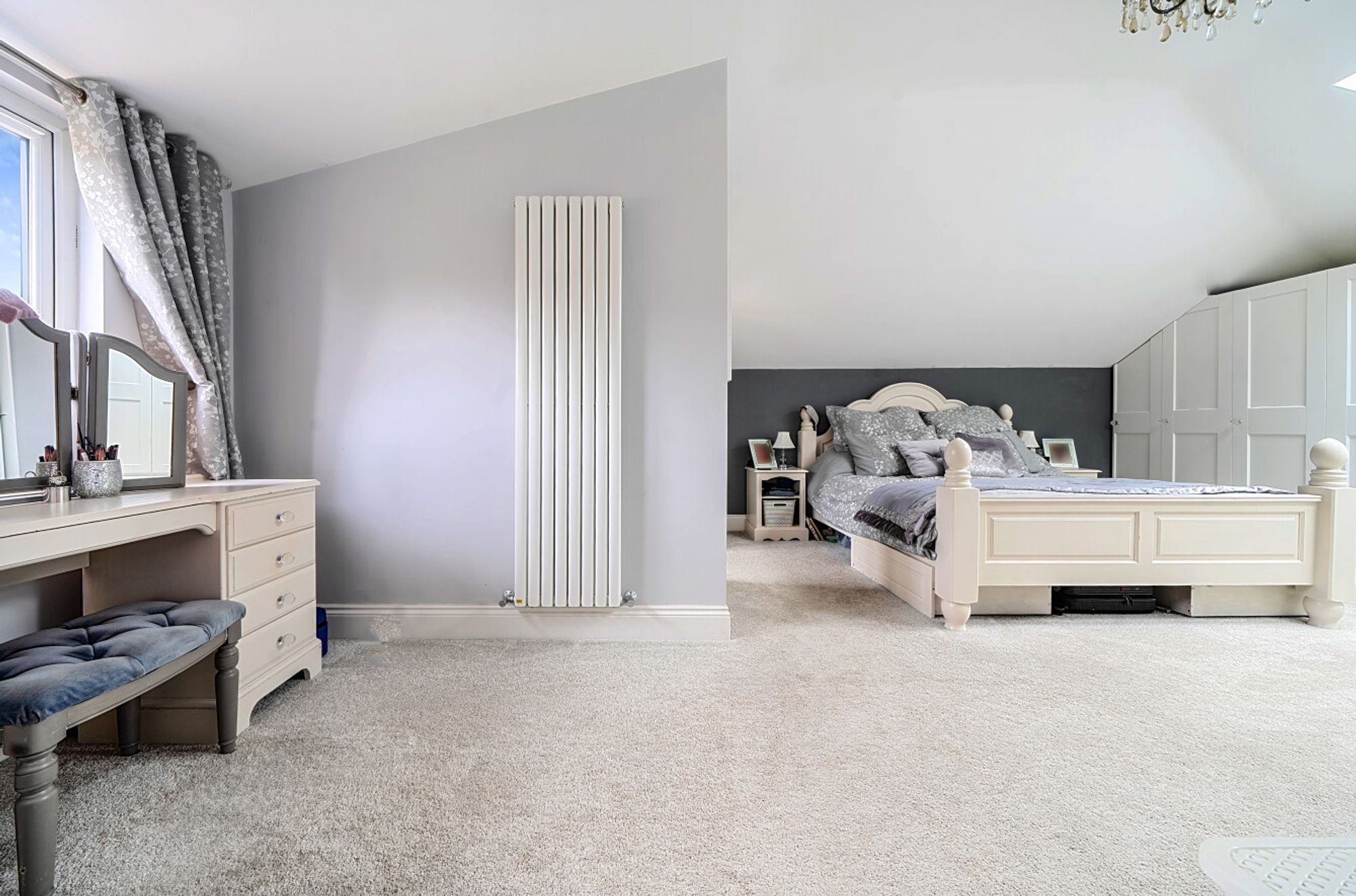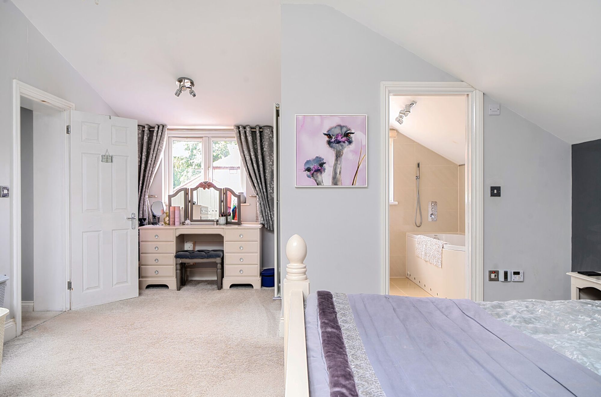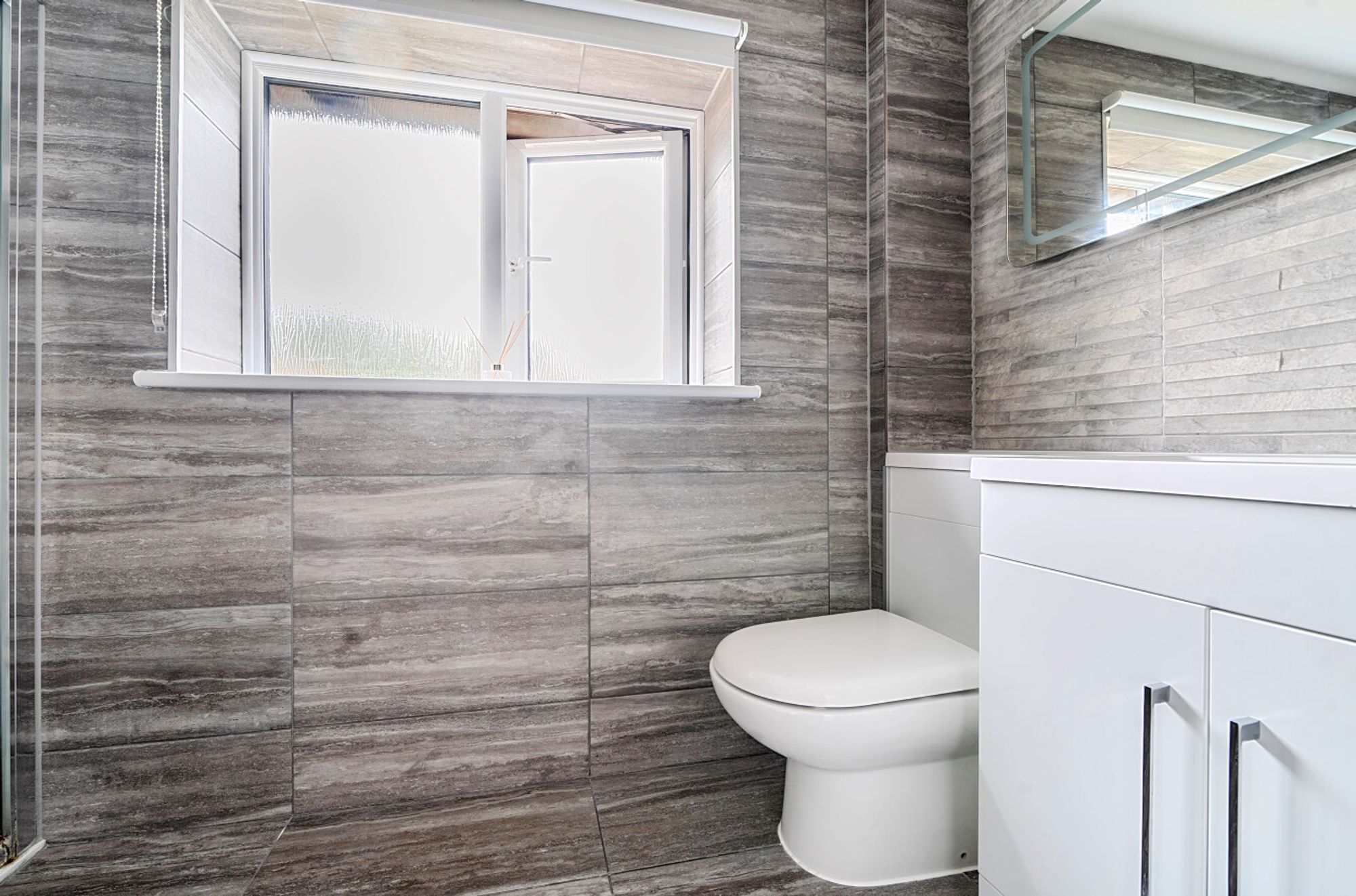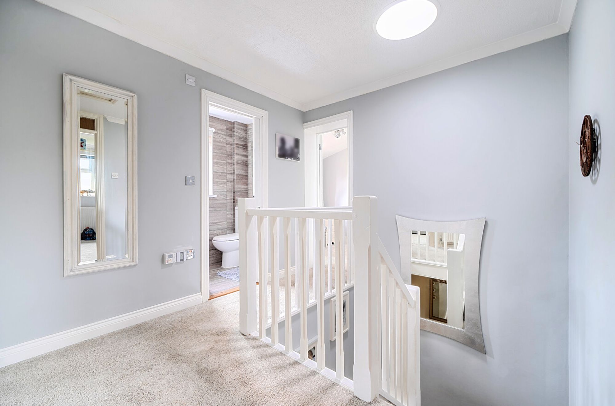 Upstairs, four well-proportioned bedrooms provide flexibility for family, guests, or hobbies. The main bedroom is enhanced by a private en-suite bathroom with a full-size bath, offering a calm retreat at the end of the day. The additional bedrooms are served by a sleek family shower room, designed with busy households in mind.