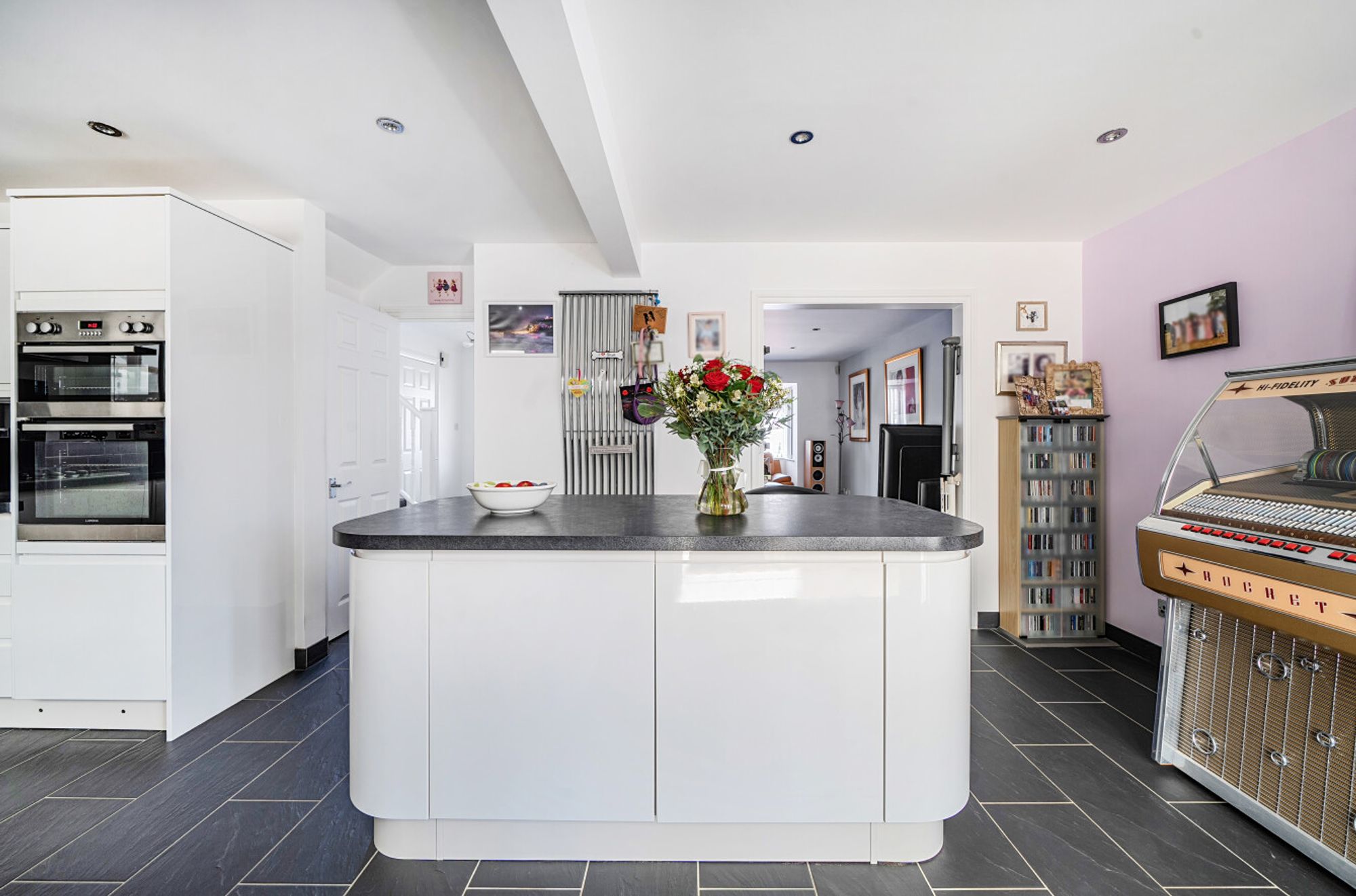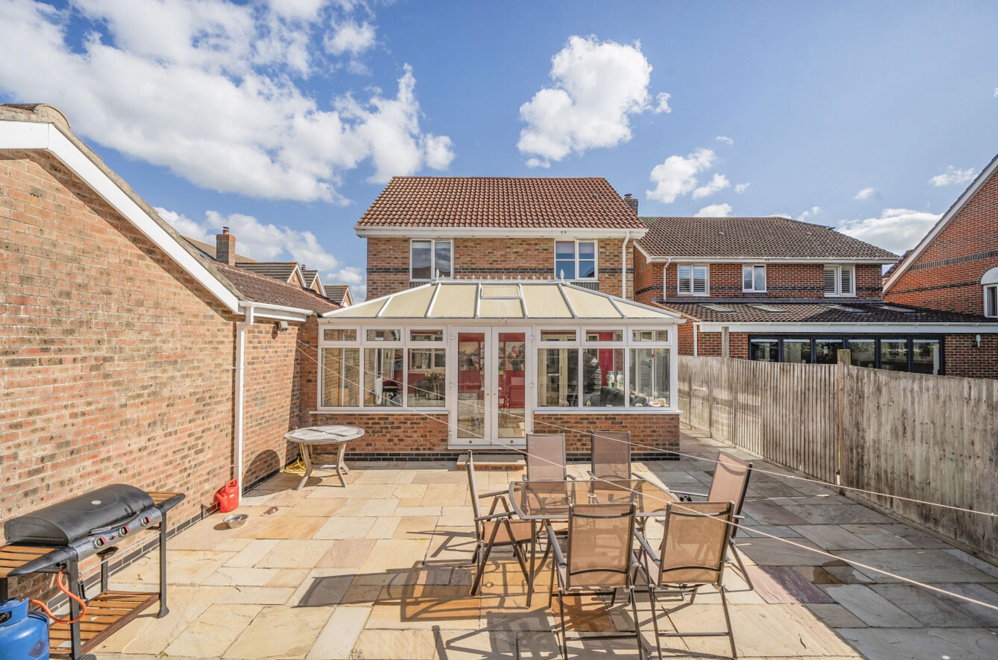 Inside, the layout is both practical and sociable, with a welcoming hallway leading to a bright, sitting room featuring a large bay window which fills the space with natural light, this area that flows into the open-plan kitchen/dining area. The kitchen is fitted with sleek gloss cabinetry, a large island breakfast bar, and integrated appliances. From here, doors open directly into a sizeable west-facing conservatory, an excellent spot to enjoy the afternoon sun while connecting seamlessly with the garden and providing an internal door to the garage.