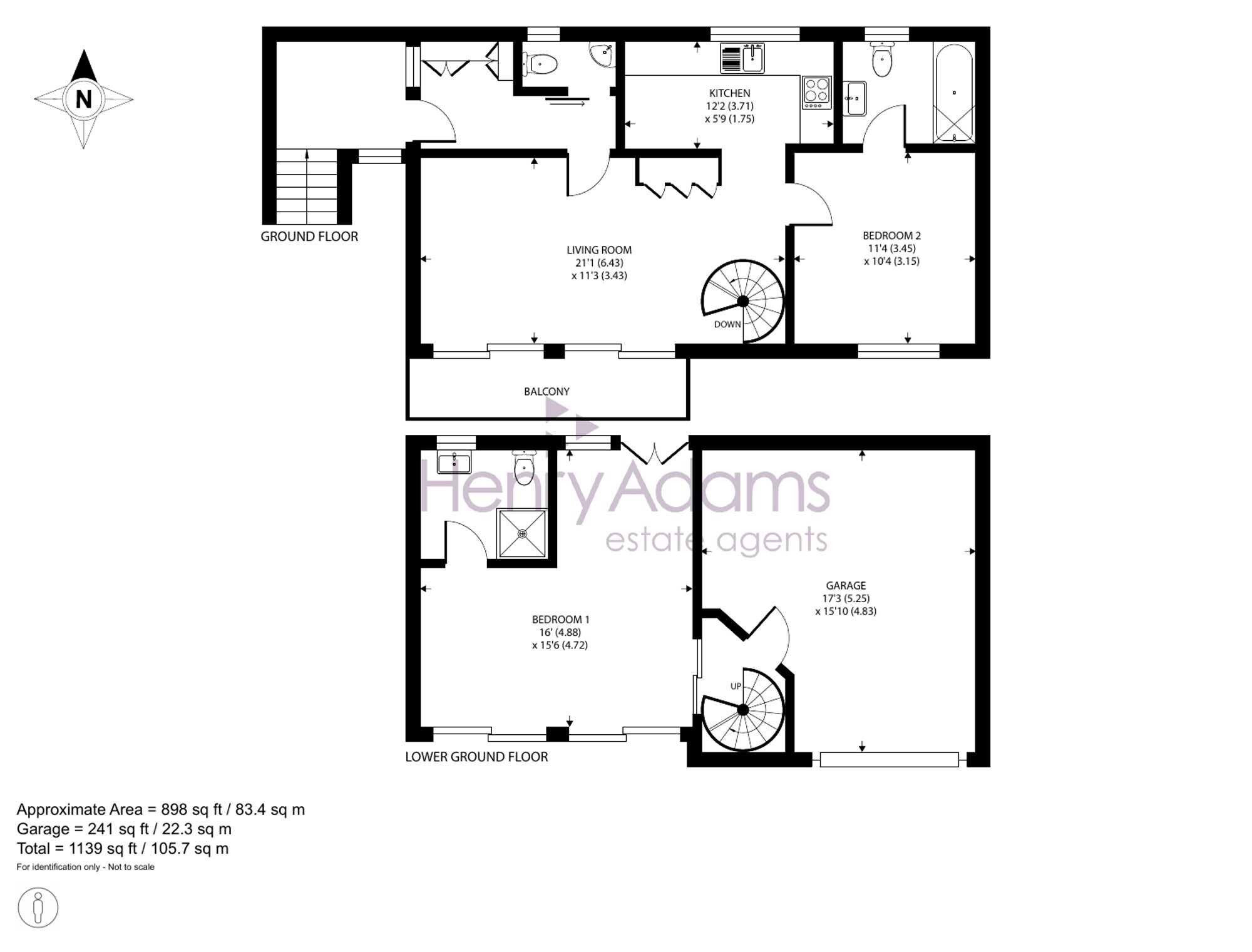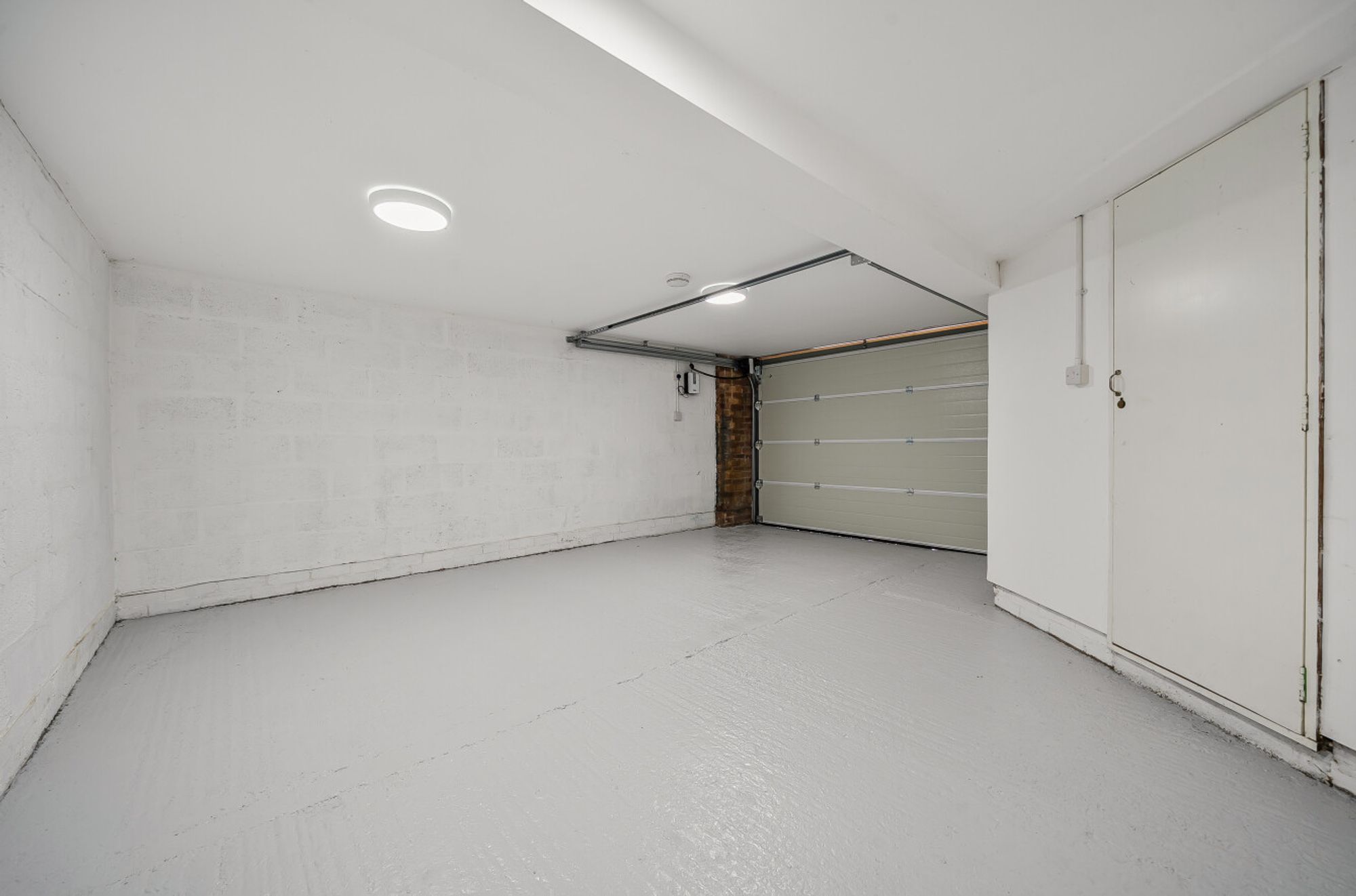 A sweeping spiral staircase leads to the ground floor, where a second double bedroom with en-suite opens directly onto a private garden. An integral garage, modernised to accommodate the modern-day vehicle, adds practicality. The garden is mainly paved with mature shrubs. Parking for two cars adds convenience to the home.