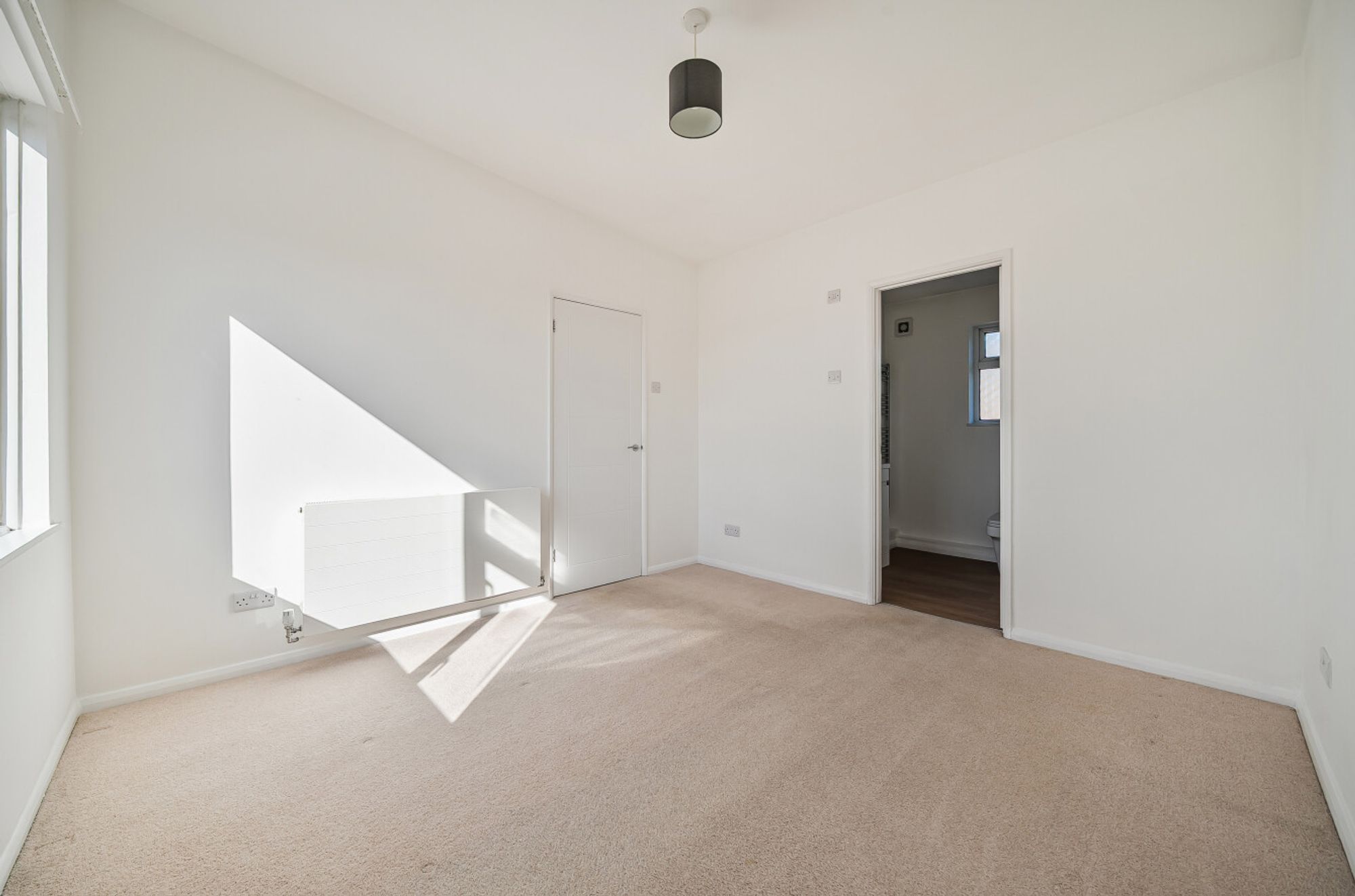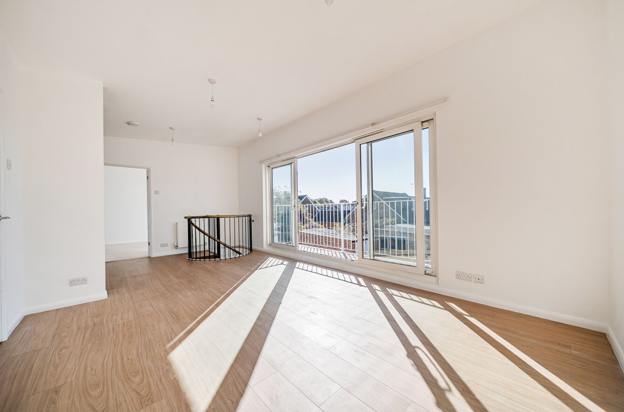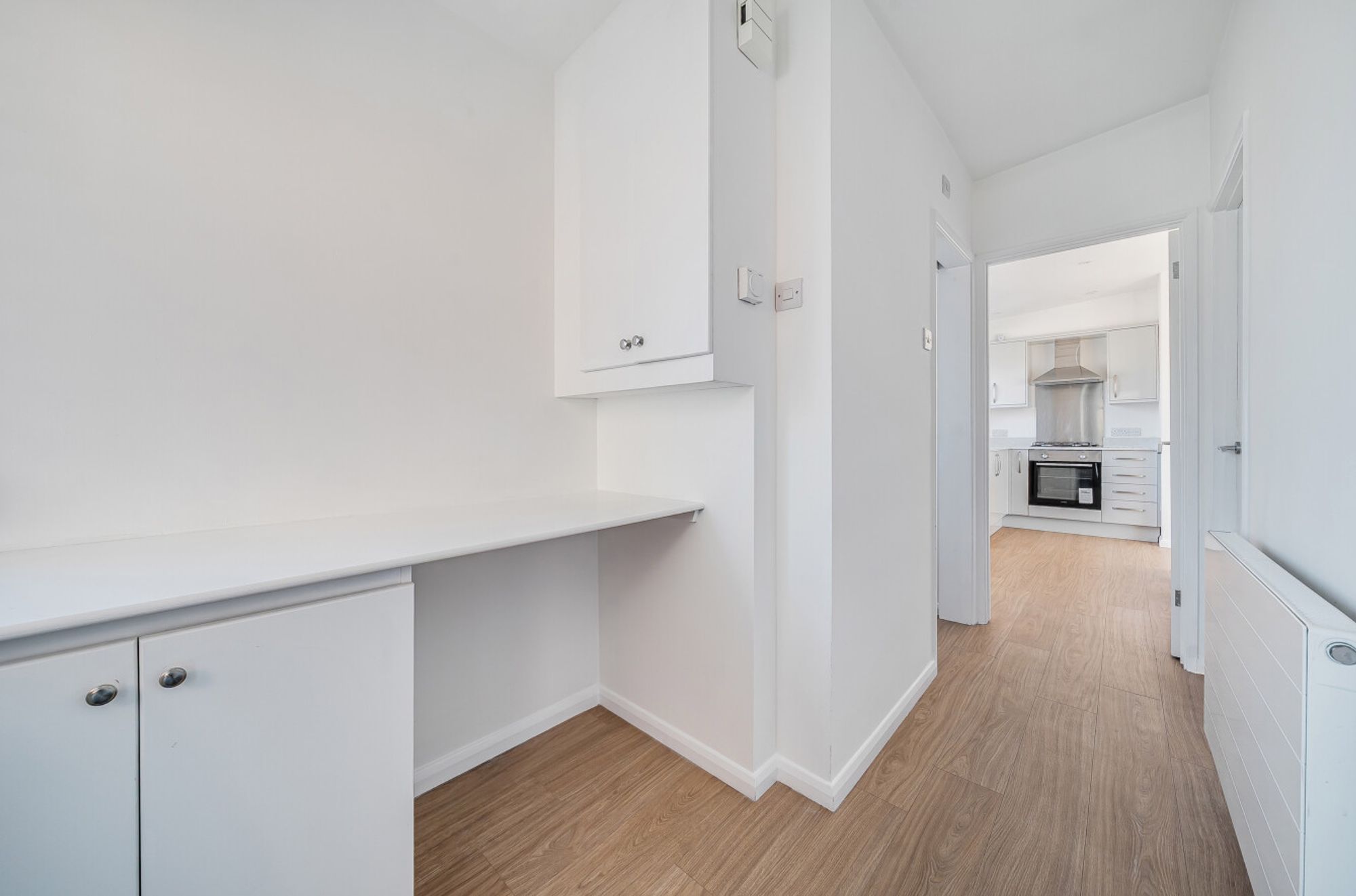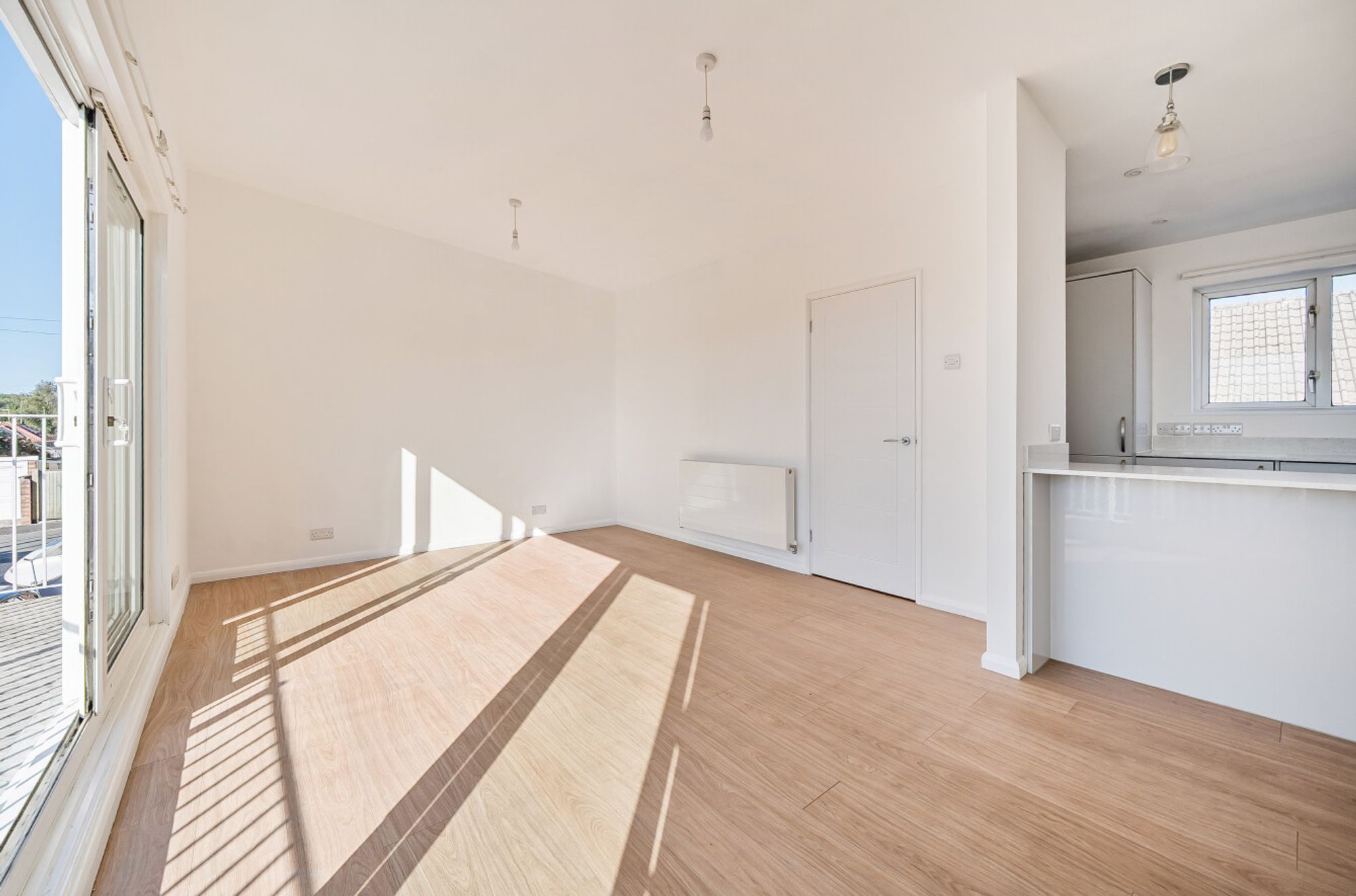 This recently transformed, immaculately presented coach house occupies a corner plot and offers contemporary living with thoughtful design throughout. The property features an upside-down layout, maximising light and space. On the first floor, a welcoming hallway leads to an open-plan kitchen and living area, with French sliding doors opening onto a Juliet balcony, ideal for enjoying summer evenings. The modern kitchen is fitted with crisp white cabinetry and new appliances, complementing the bright and airy feel of the space. The principal bedroom on this level benefits from a private bathroom, while a guest WC adds convenience.
