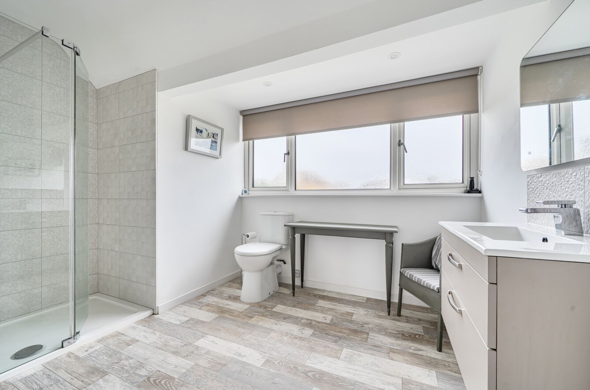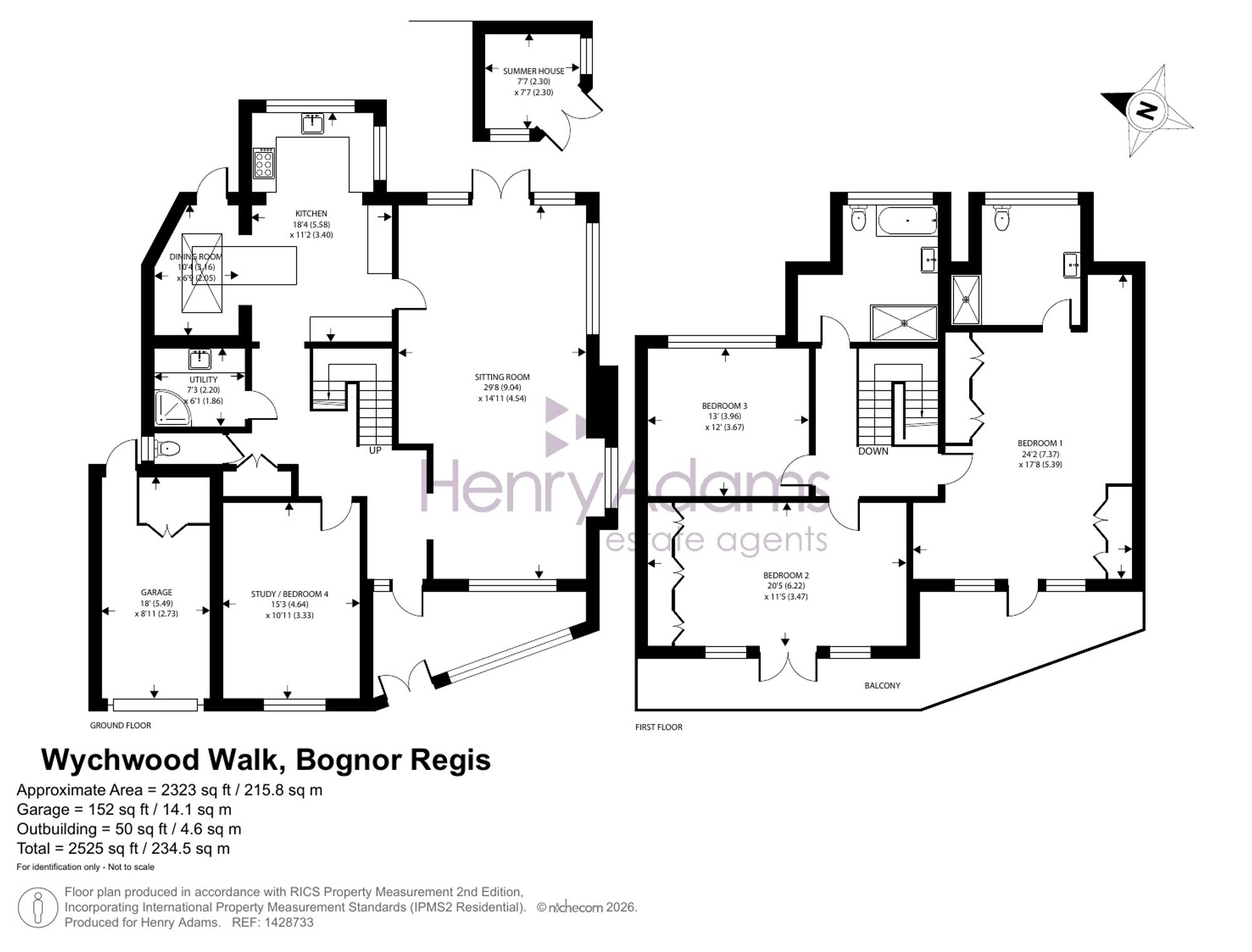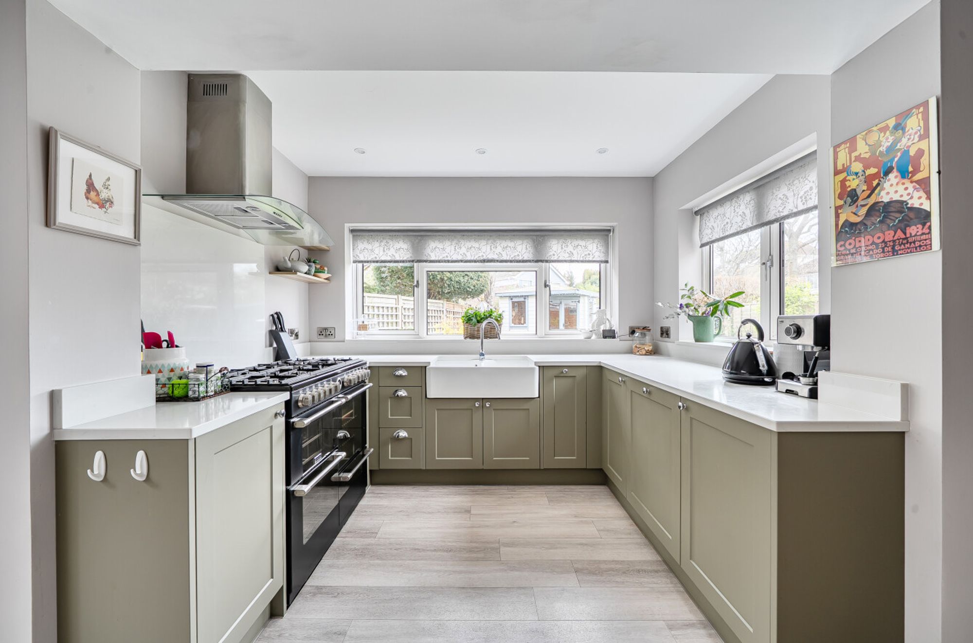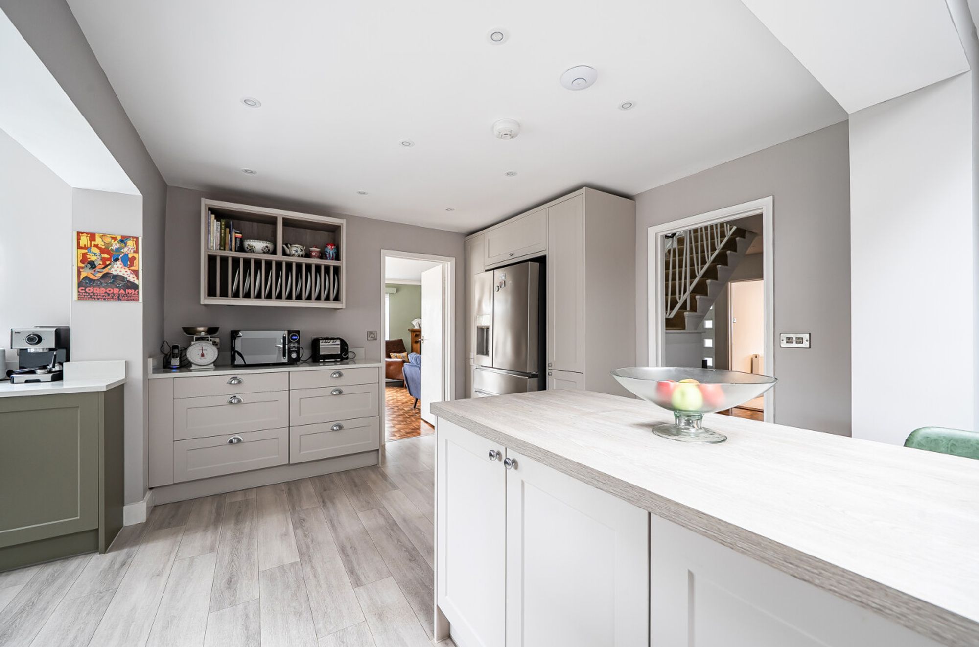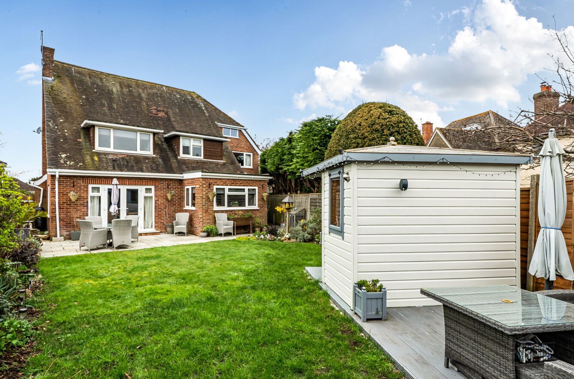 Upstairs, the large principal bedroom suite offers a luxurious retreat, complete with generous wardrobe space and direct access to a wonderful first floor balcony that gets the evening sun. Two further large bedrooms provide excellent accommodation for family or guests, while a well-appointed family bathroom and additional cloakroom complete the versatile layout. The property also benefits from a garage, offering secure parking or additional storage.