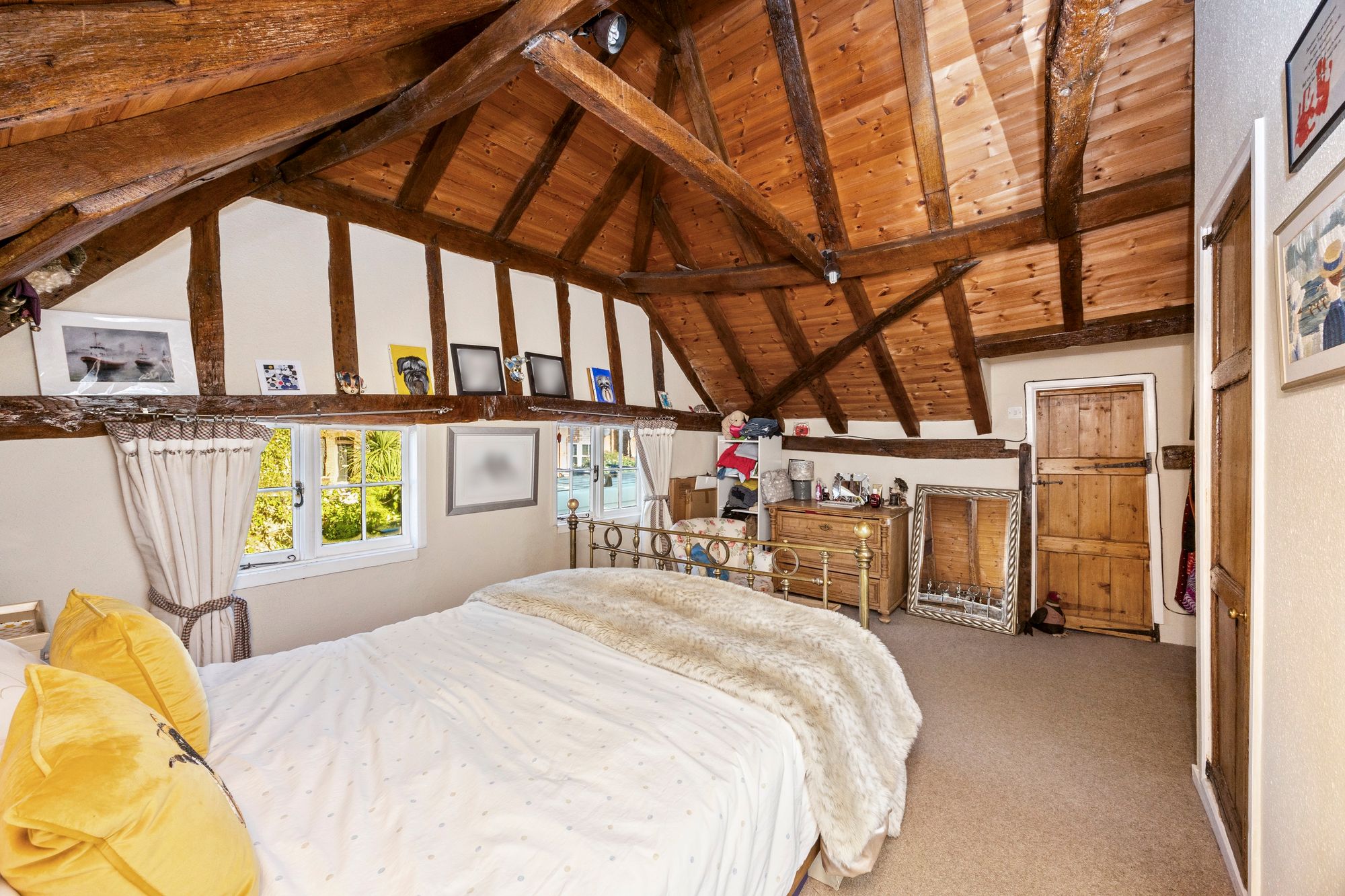 The first staircase of two leads from the reception hallway up to two bedrooms; both of which enjoy an aspect to the front of the property, the main bedroom with a vaulted ceiling has an ensuite shower room and a wash hand basin, a second turning staircase leads up to a further well proportioned double bedroom which enjoys a beamed vaulted ceiling and views to both sides of the property.